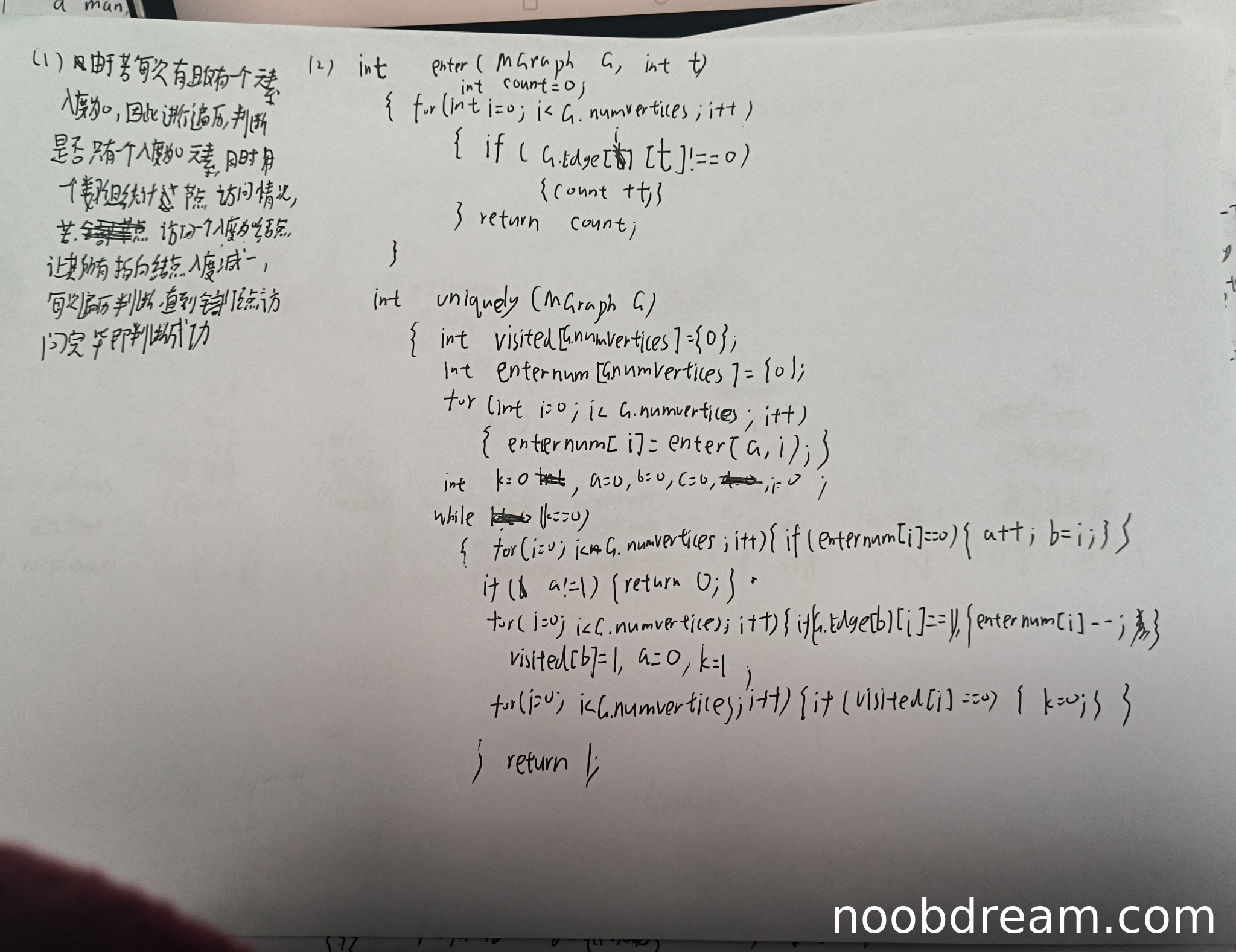 理由:学生的基本设计思想提到了"每次有且仅有一个零入度节点"这一关键点,这与标准答案中判断拓扑序列唯一性的核心思想一致。但是学生的描述存在以下问题:1)没有明确提到需要初始化入度数组;2)描述中"每个节点访问一个入度为零节点"表述不够准确,应该是每次迭代处理一个入度为0的节点;3)没有完整描述算法流程。因此扣除2分。