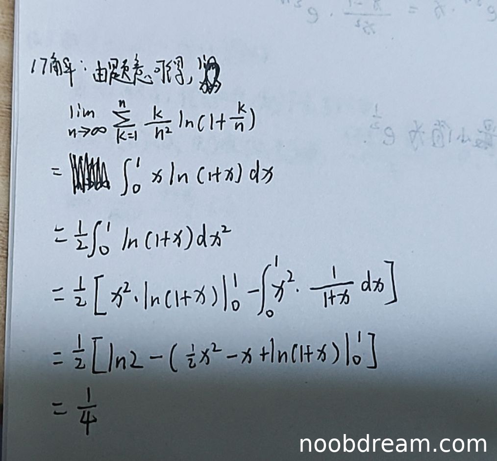 学生正确地将极限和式转化为定积分 \(\int_{0}^{1} x \ln(1+x) \, dx\),这一步思路正确,得2分。