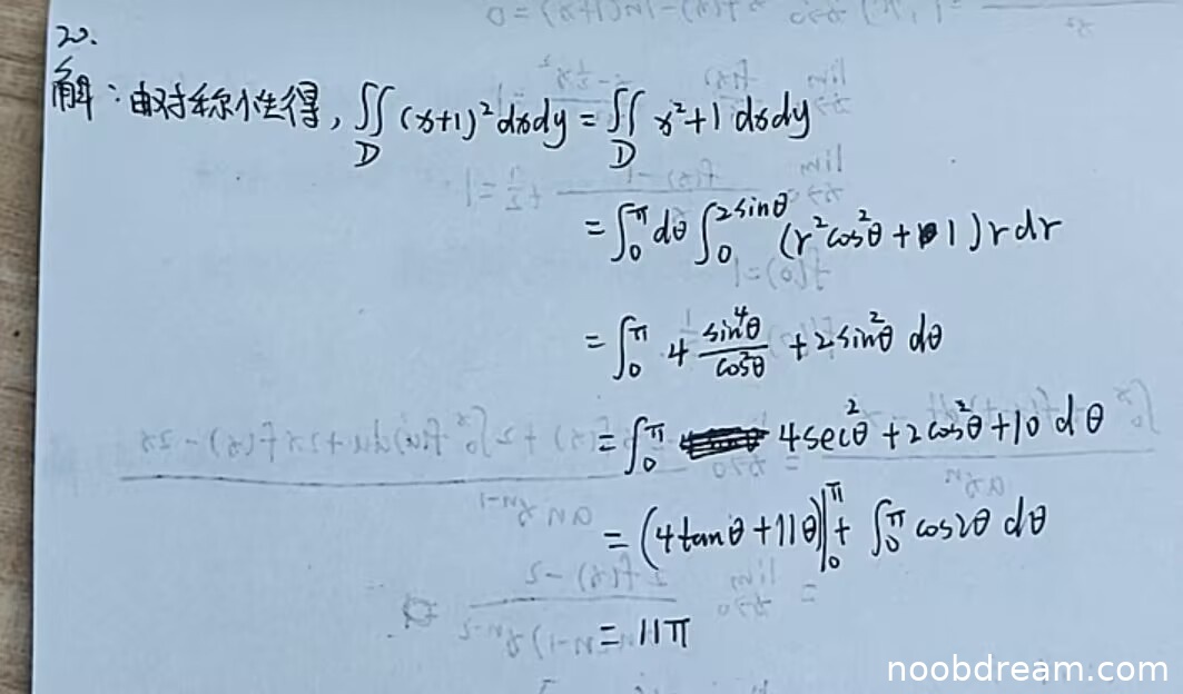 - 在极坐标积分中,被积函数应为 \((r^2\cos^2\theta + 1) \cdot r\),但后续计算中出现了 \(4\frac{\sin^4\theta}{\cos\theta}\) 和 \(2\sin^2\theta\),其中 \(4\frac{\sin^4\theta}{\cos\theta}\) 的推导错误,且分母出现 \(\cos\theta\) 在积分区间内可能为零,属于逻辑错误,扣3分。