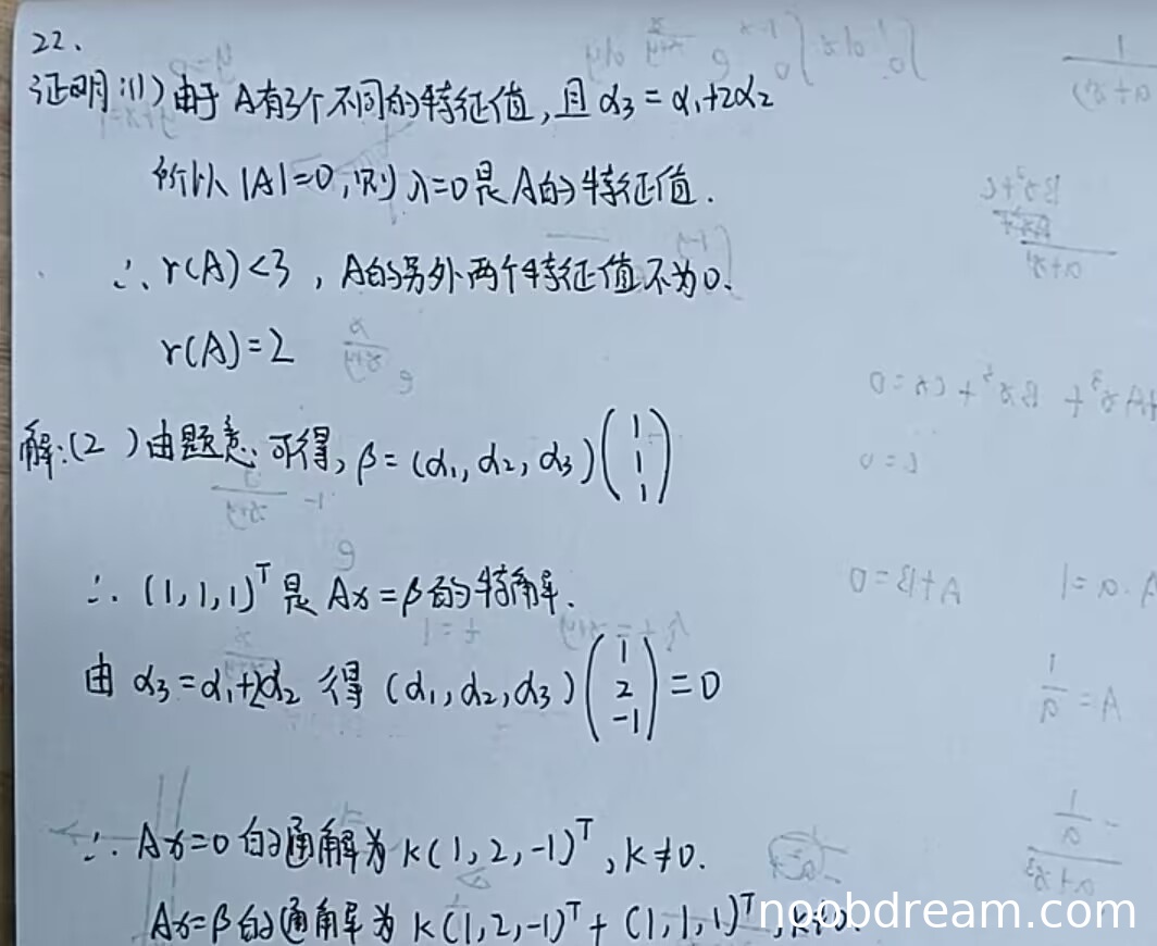 学生答案中给出了以下推理:由α₃=α₁+2α₂得到|A|=0,从而λ=0是特征值;由A有三个不同特征值得到r(A)<3且另外两个特征值非零,最终得到r(A)=2。