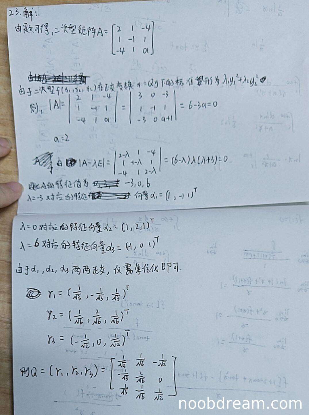 注:学生作答基本正确,主要问题在于特征向量的顺序安排与标准答案不同,但数学上等价;另外在第二次识别中标准型写成了三项,但根据上下文判断是识别错误,不扣分。