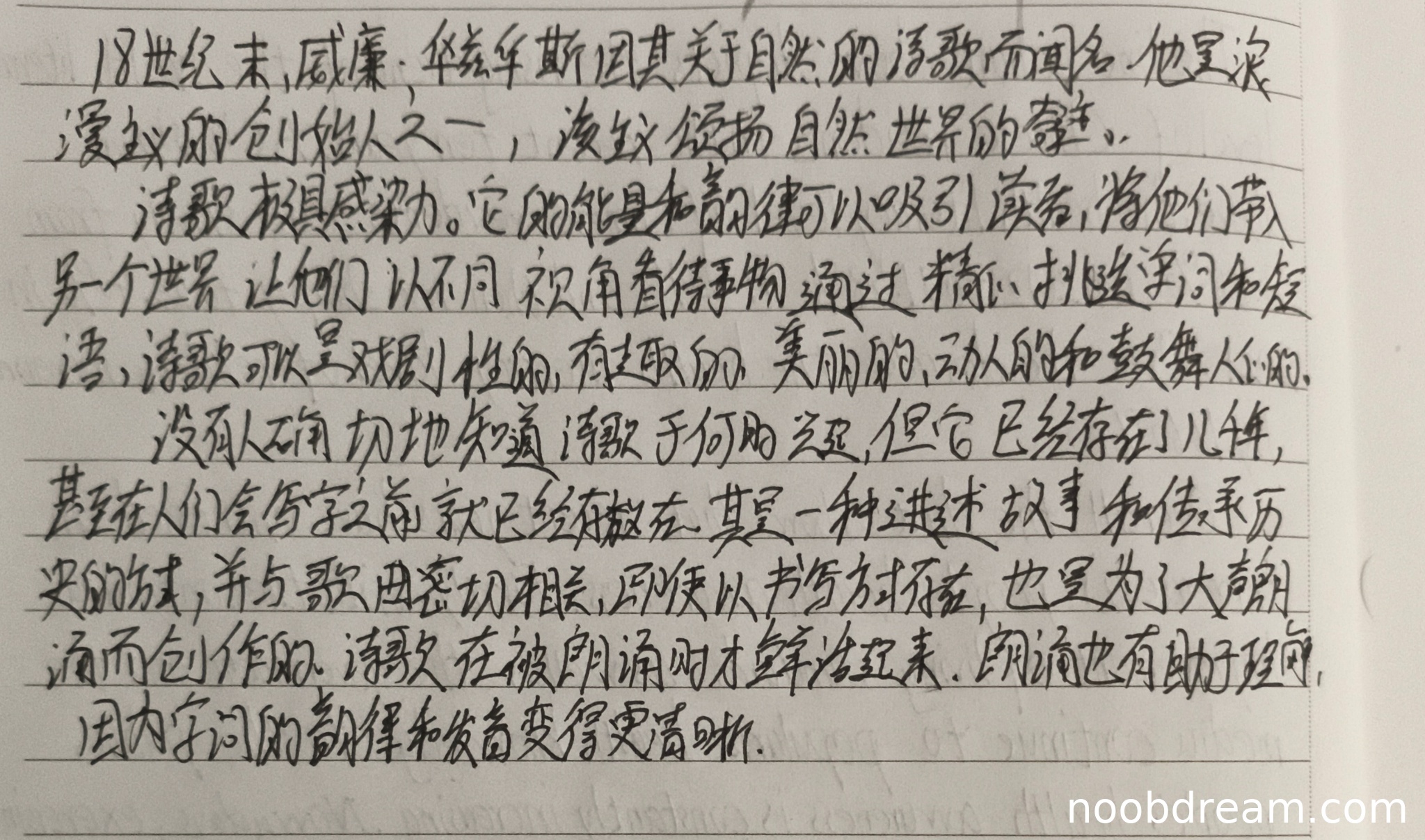 第一段翻译准确传达了原文信息,包括时间背景(18世纪末)、人物身份(浪漫主义创始人)及核心内容(歌颂自然)。"喜欢颂扬"在第一次识别中略显口语化,但第二次识别修正为"歌颂颂扬",虽存在重复但语义正确。整体无重大逻辑错误,得5分。