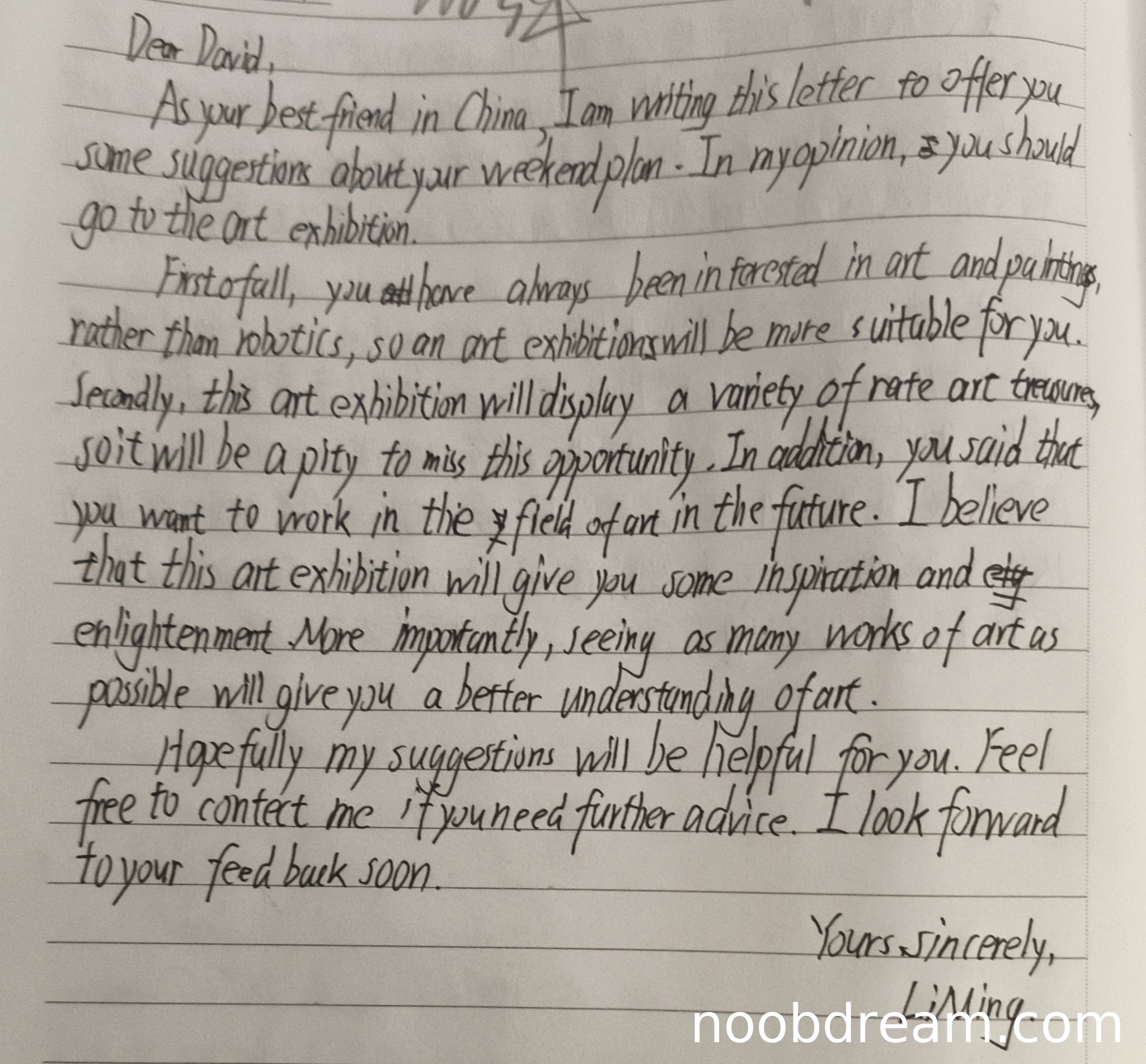 理由:内容完整覆盖题目要求的所有要点。明确提出了建议(去艺术展),并给出了多个充分理由(对艺术感兴趣、展出稀有艺术品、对未来职业有启发、增进对艺术的理解)。