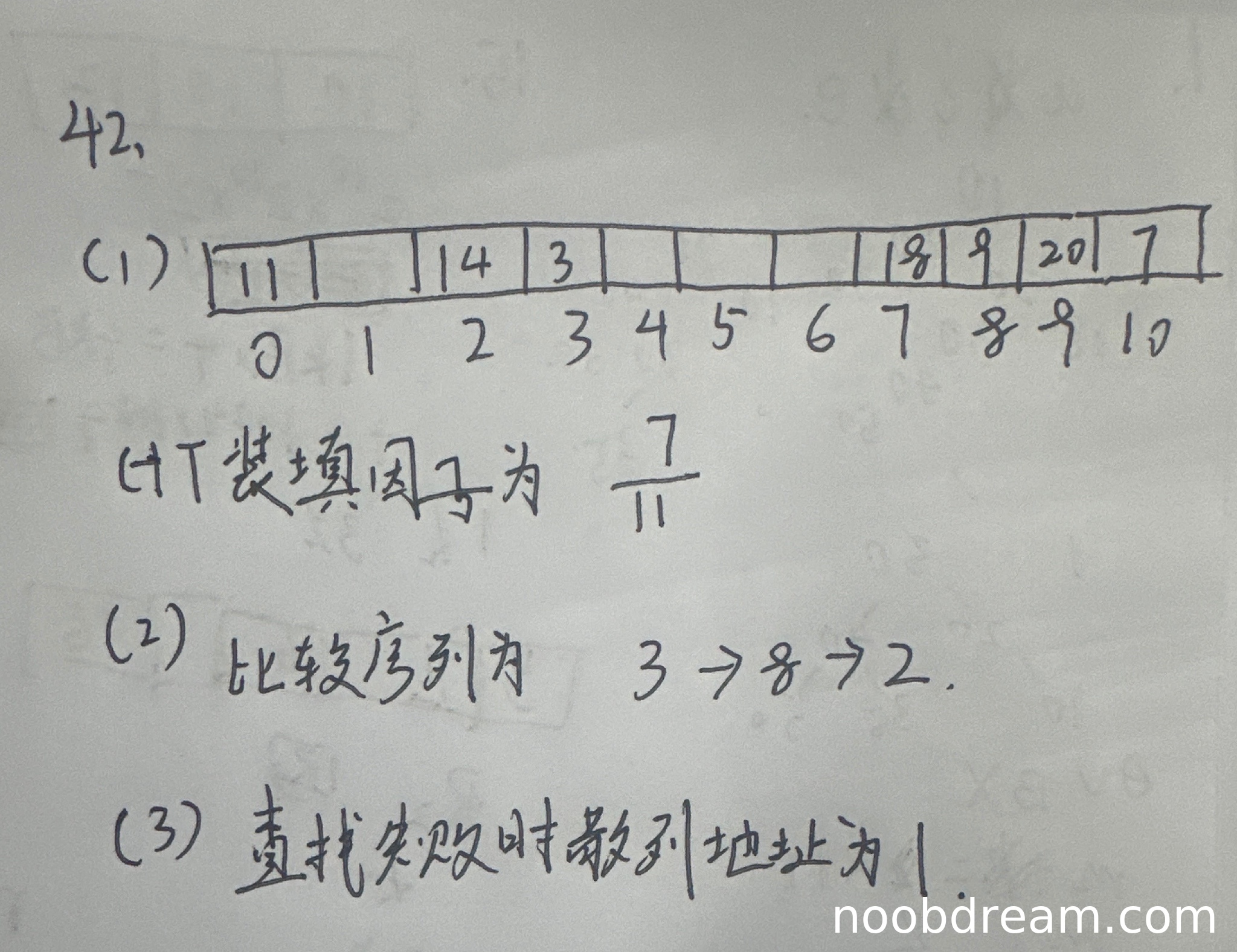 学生答案给出了装填因子为7/11,与标准答案一致。虽然学生未画出散列表,但题目要求计算装填因子,且装填因子的计算正确,因此不扣分。得6分。