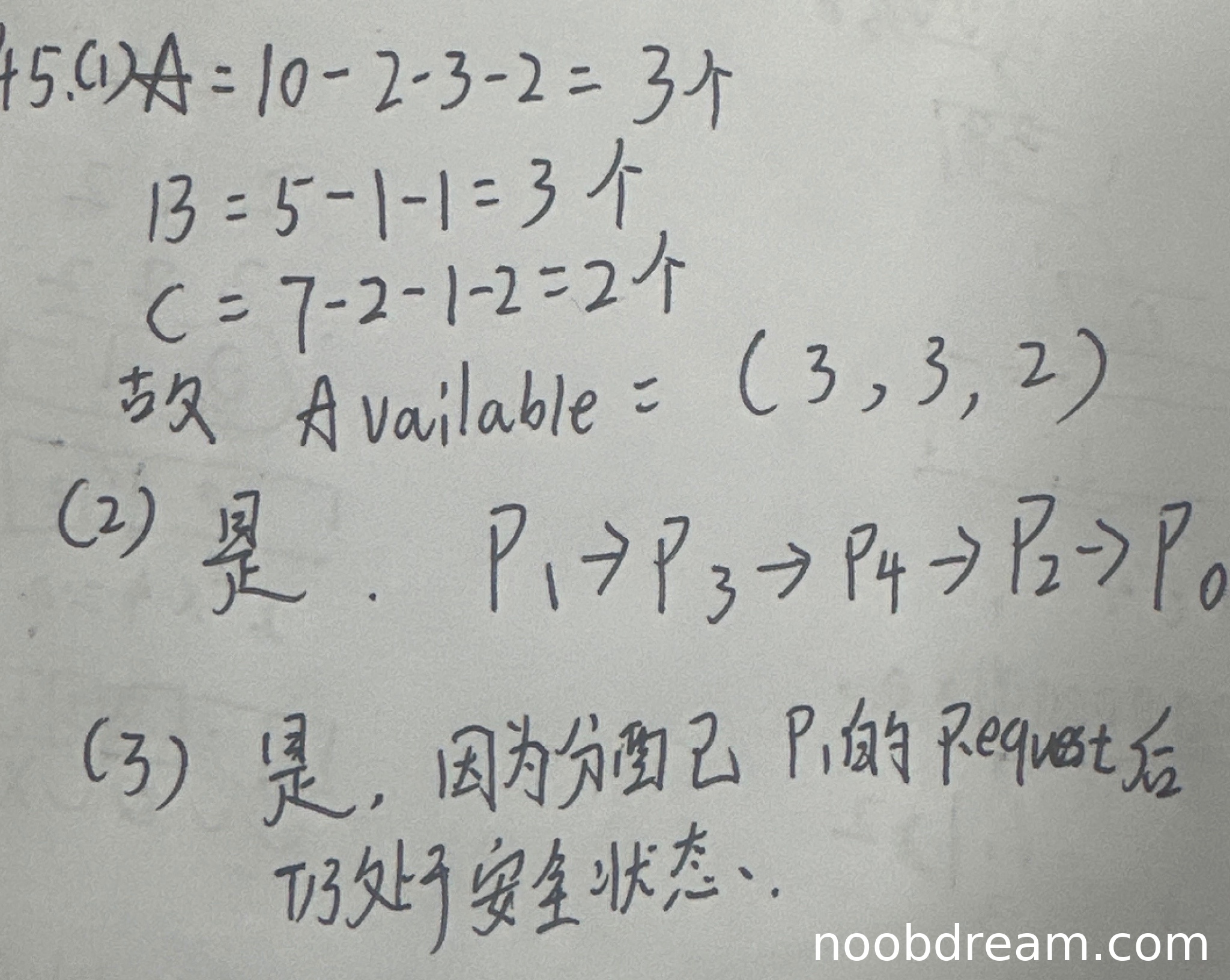 学生正确计算了可用资源Available=(3,3,2),计算过程清晰,与标准答案一致。得2分。