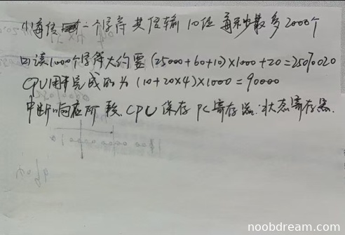 学生计算完成1000字符所需时间:第一次识别结果为25070020,与标准答案一致;第二次识别结果为2507020,存在计算错误(应为25070020),但第一次识别正确,按正确给分。CPU用时计算为90000,正确。中断响应阶段操作描述基本正确(保存PC和状态寄存器,标准答案还包括关中断和识别中断源),但核心操作已包含,给分。因此该部分得6分。