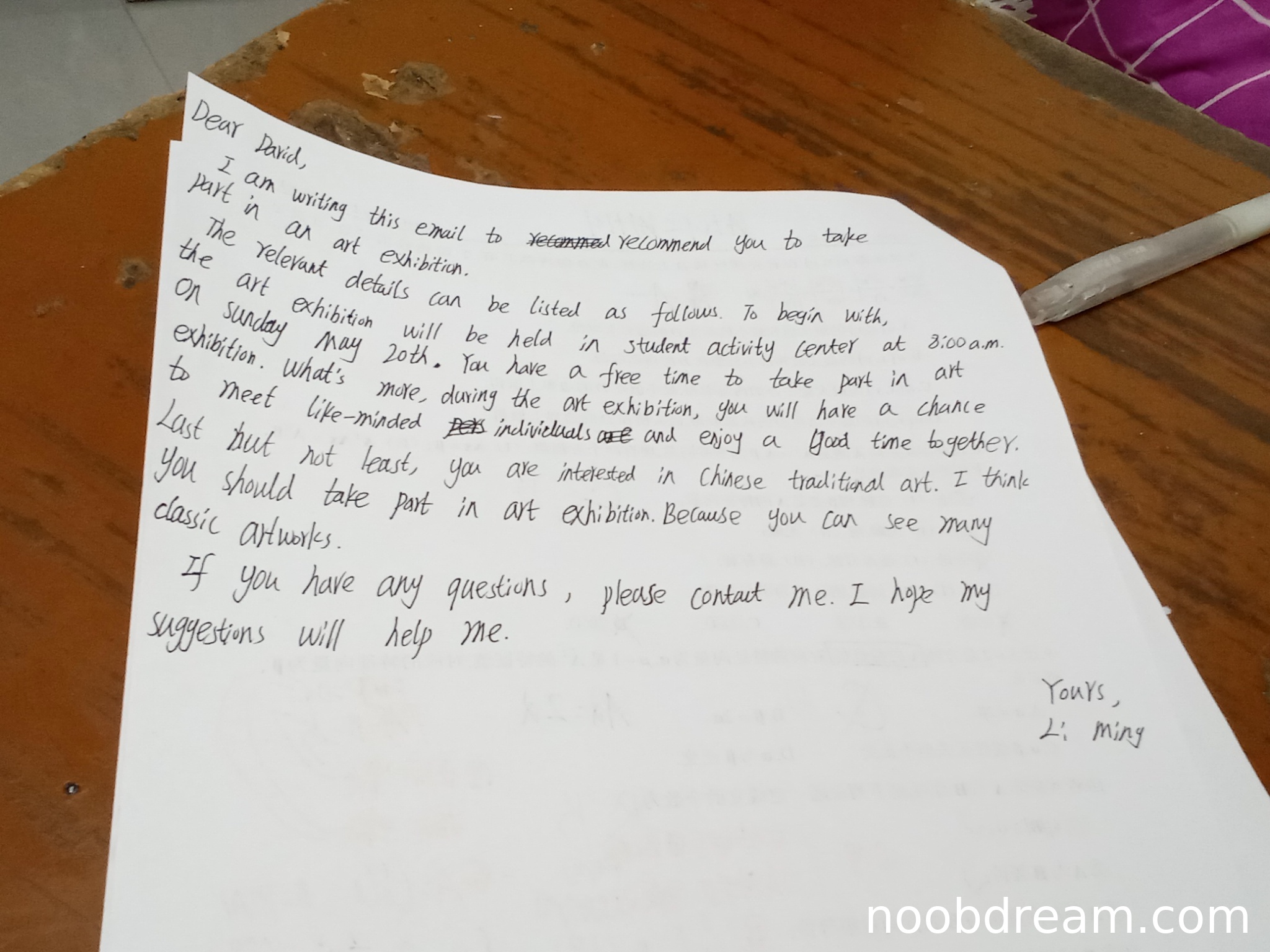 理由:邮件格式完整正确,包含称呼、正文、结束语和署名。语域基本恰当,使用了"Dear David"和"Yours"等适合朋友间通信的表达。