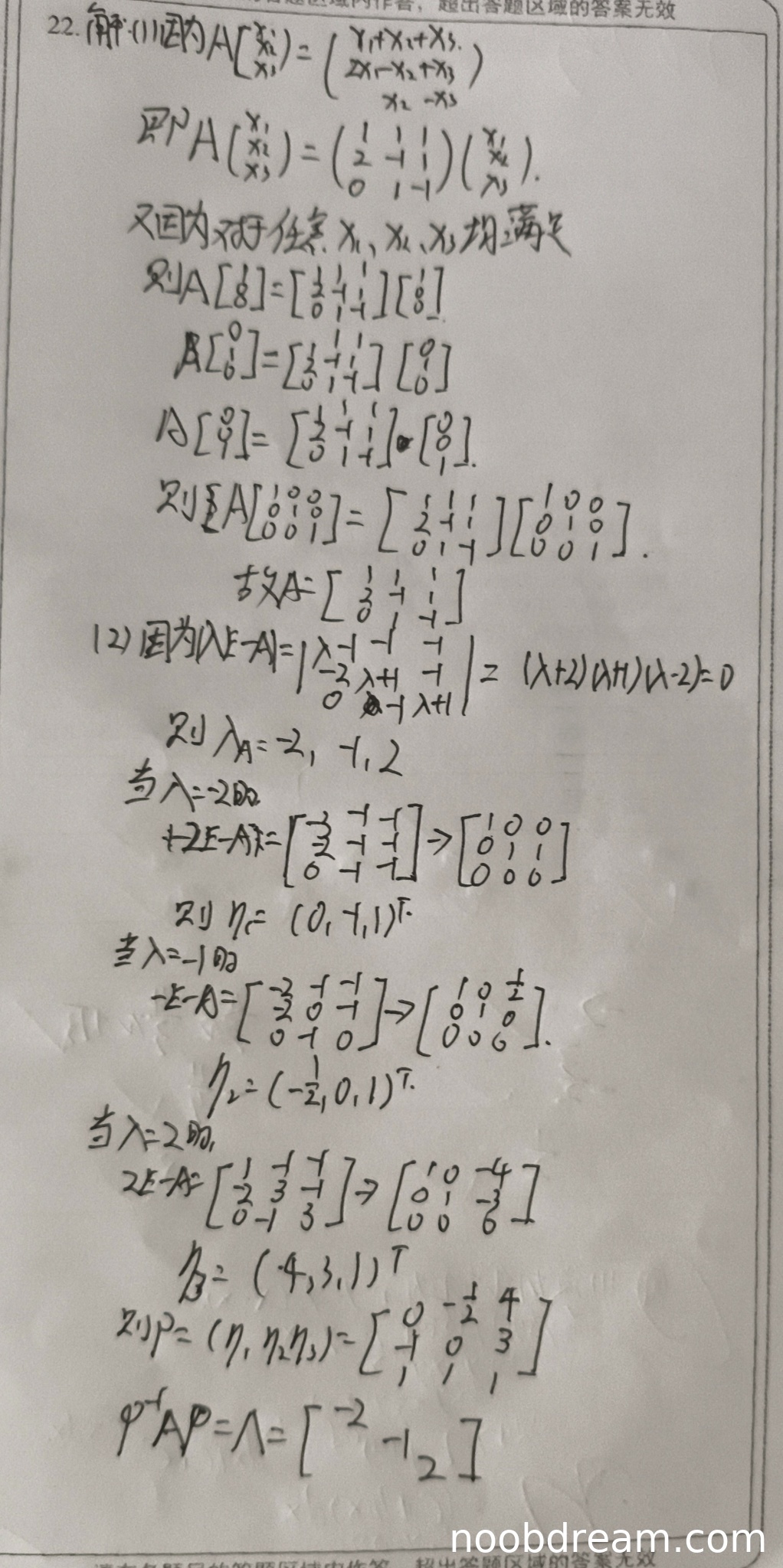第1次识别结果:特征值计算正确,但特征向量计算有误: - λ=-2时特征向量应为(0,1,-1)^T,学生得到(0,-1,1)^T,相差负号,根据禁止扣分规则可能为书写问题,不扣分。 - λ=-1时特征向量应为(-1,0,2)^T,学生得到(-1/2,0,1)^T,虽成比例但未化简为整数形式,根据规则不扣分。 - λ=2时特征向量正确。 但最终P矩阵为 \(\begin{bmatrix} 0&-\frac{1}{2}&4\\ -1&0&3\\ 1&1&1\end{bmatrix}\),与标准答案不一致,且Λ写为行向量形式错误。存在逻辑错误,扣3分。