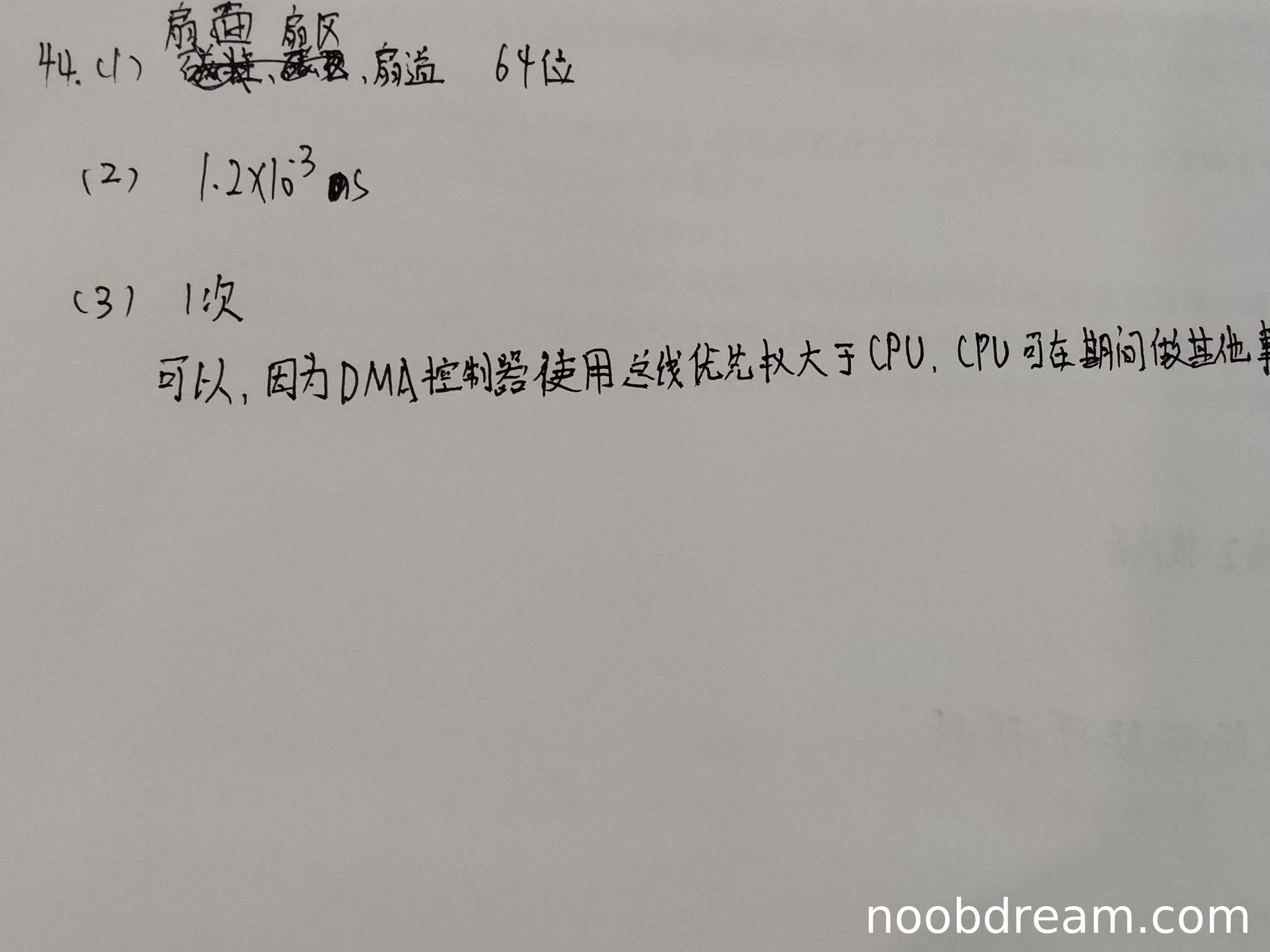 第二问:学生答案中给出“可以”,与标准答案一致,且理由正确(DMA控制器使用总线优先权大于CPU),因此得1分。