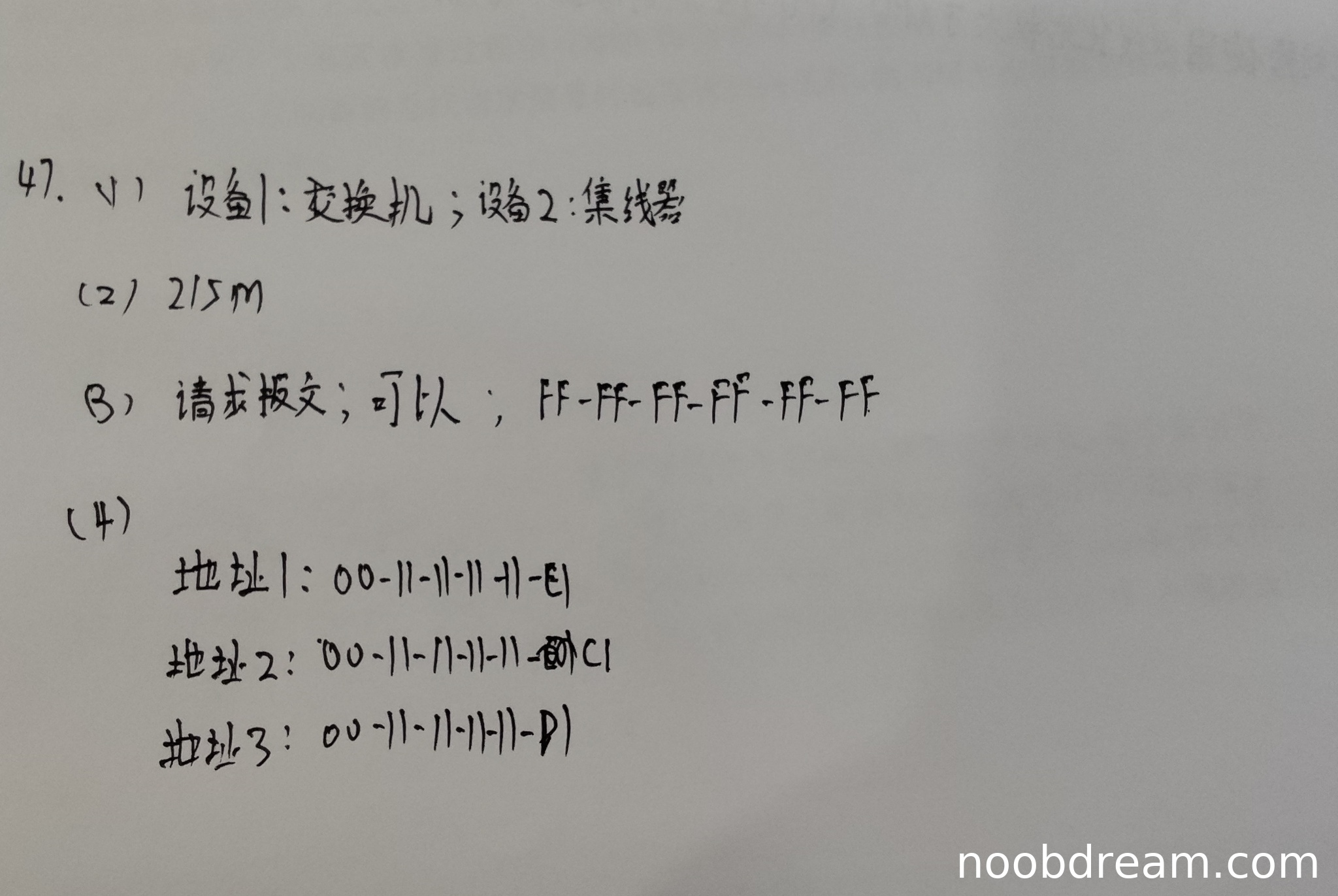 地址1(00-11-11-11-11-E1)正确;地址2(00-11-11-11-11-C1)正确;地址3(00-11-11-11-11-D1)正确,与标准答案完全一致。得3分。