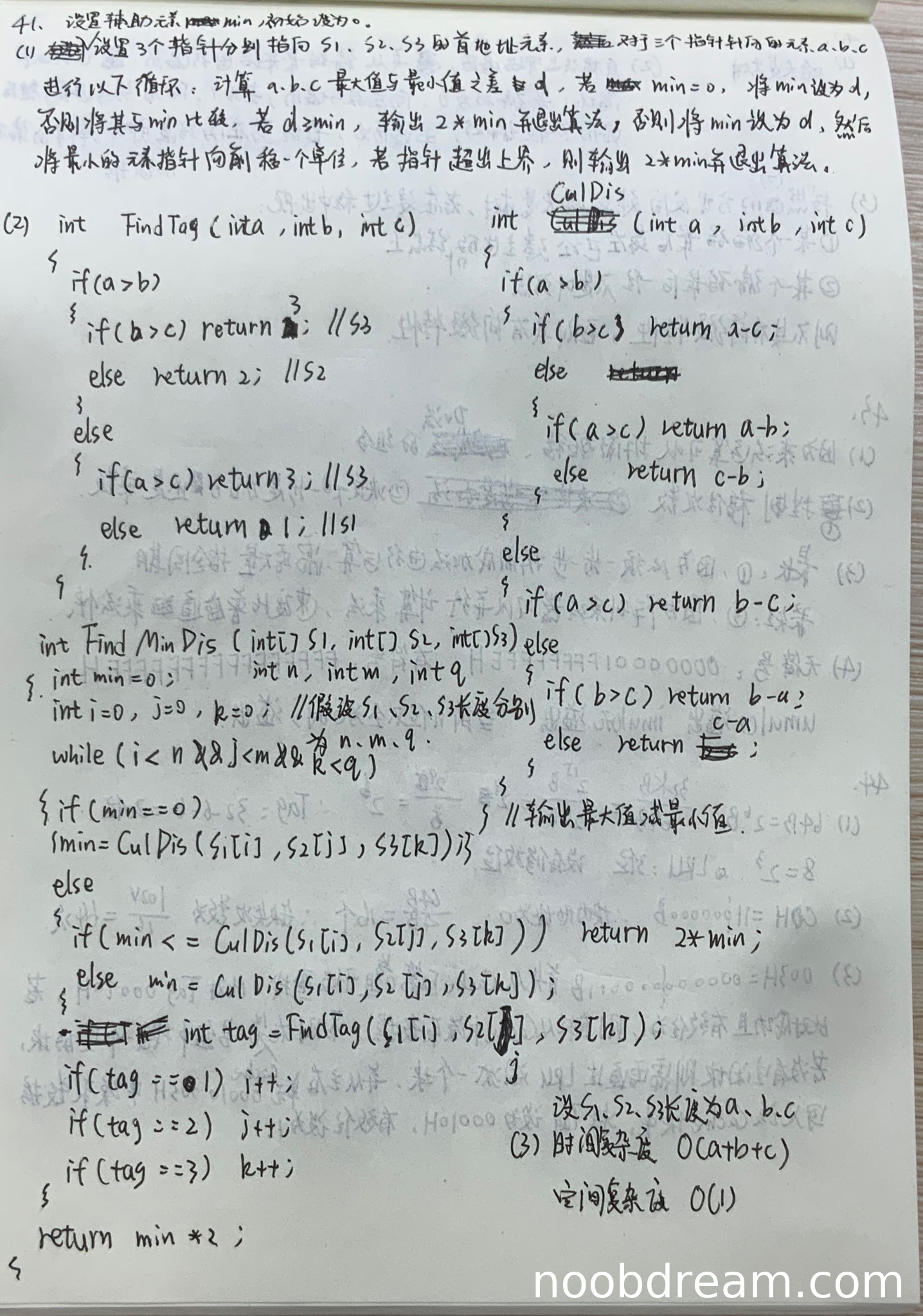 理由:学生的基本设计思想正确,采用了三指针方法,每次移动最小元素的指针,这与标准答案的高效算法思路一致。但存在一些表述不够清晰的地方,比如"输出2*min并退出算法"的条件判断逻辑不够准确(当d≥min时直接退出可能错过更小距离),扣1分。