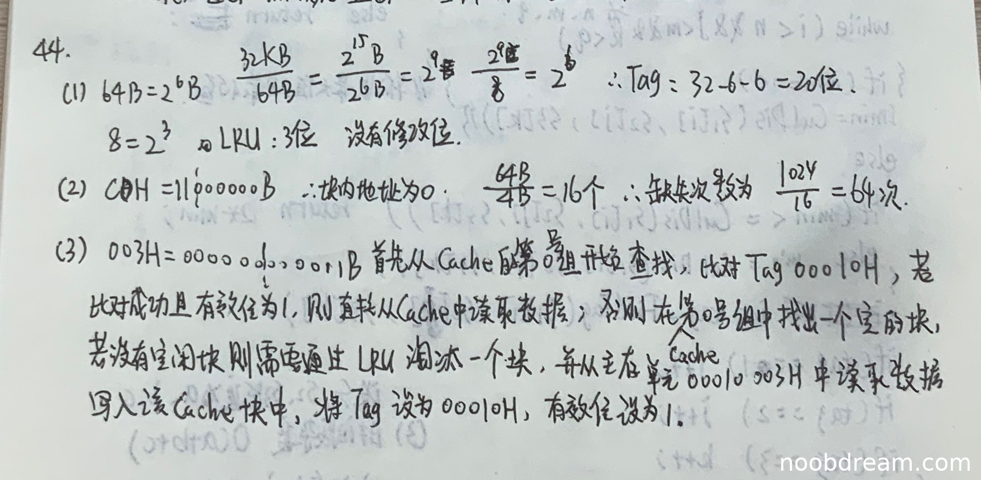 学生正确计算了Tag位为20位,LRU位为3位,并指出没有修改位,与标准答案一致。得3分。