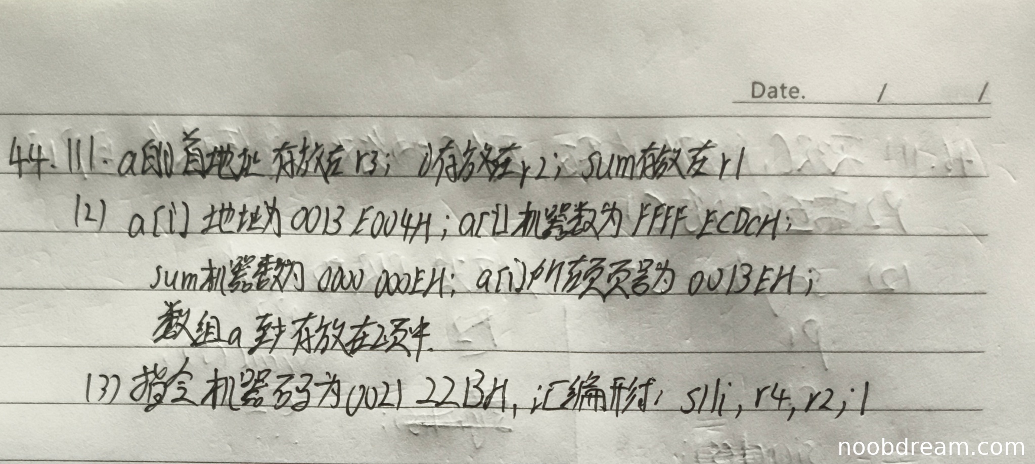 学生第一次识别结果中明确写出"a的首地址存放在r3;i存放在r2;sum存放在r1",与标准答案完全一致。第二次识别结果中"b"可能是"i"的识别错误,但结合上下文判断为误写。根据误写不扣分原则,给满分3分。