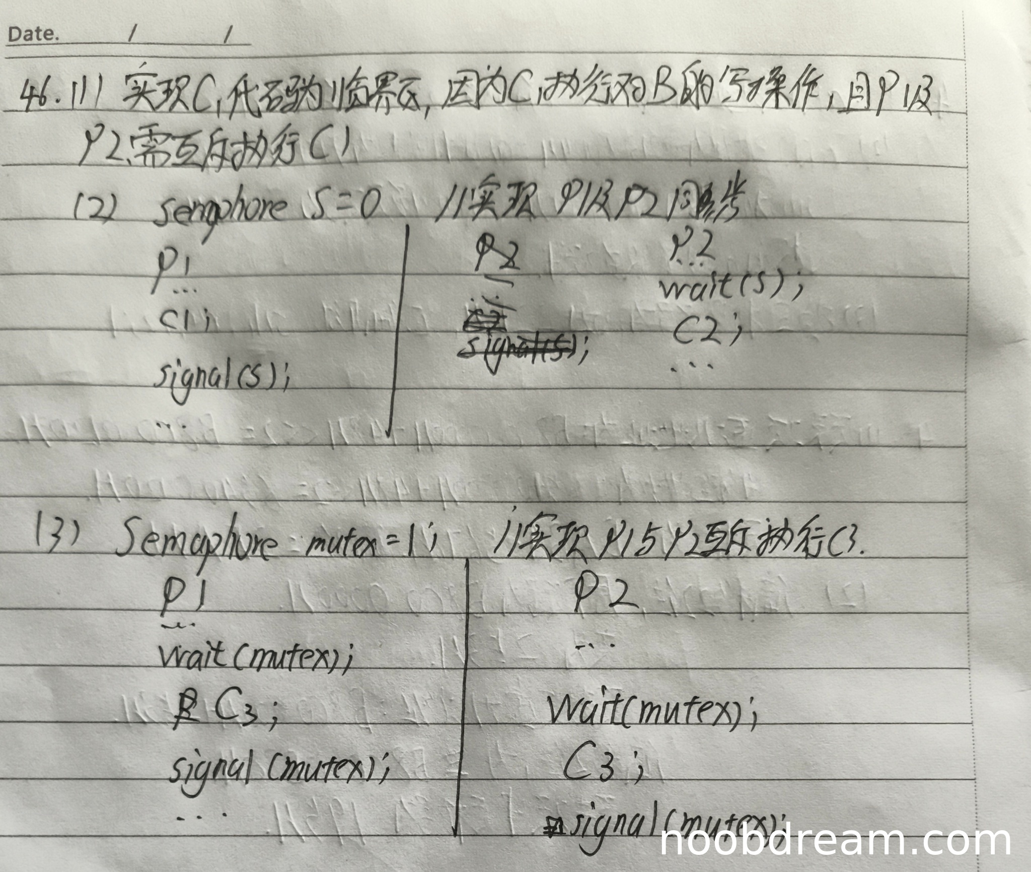 学生正确使用mutex=1实现互斥,代码逻辑与标准答案一致。得3分。
