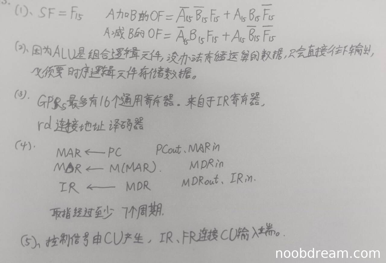 学生答案中,SF的逻辑表达式为F15,与标准答案一致;A加B和A减B的溢出标志OF逻辑表达式也与标准答案完全一致。因此,本小题得3分。
