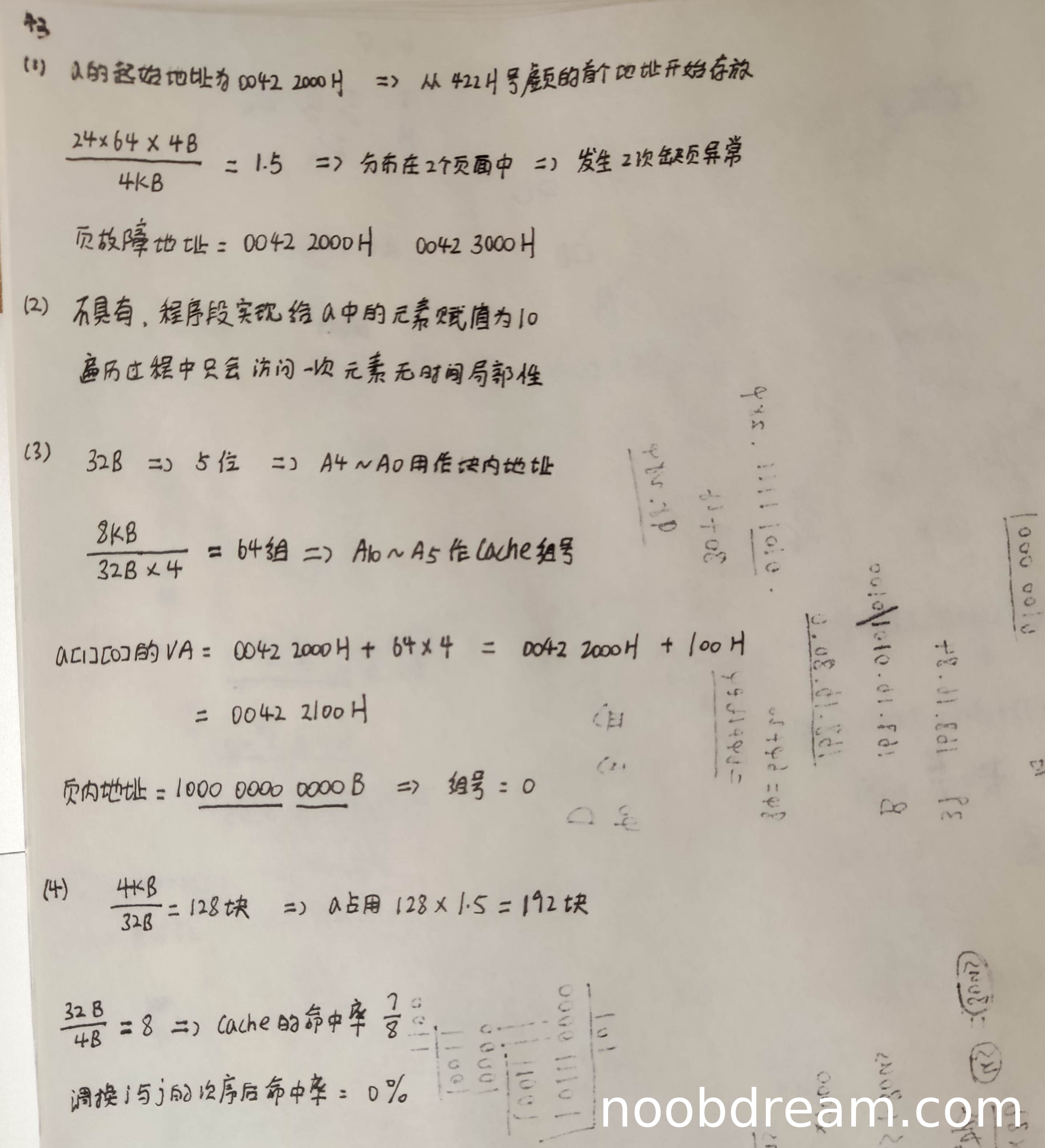 理由:学生正确指出了块内地址位(A4~A0)和a[1][0]的虚拟地址(0042 2100H)。但在Cache组号的计算上存在错误:第一次识别中组号计算为0,第二次识别中Cache组号位标识为A0~A5(应为A10~A5),且组号计算结果为0(实际应为8)。由于组号计算错误,扣1分。