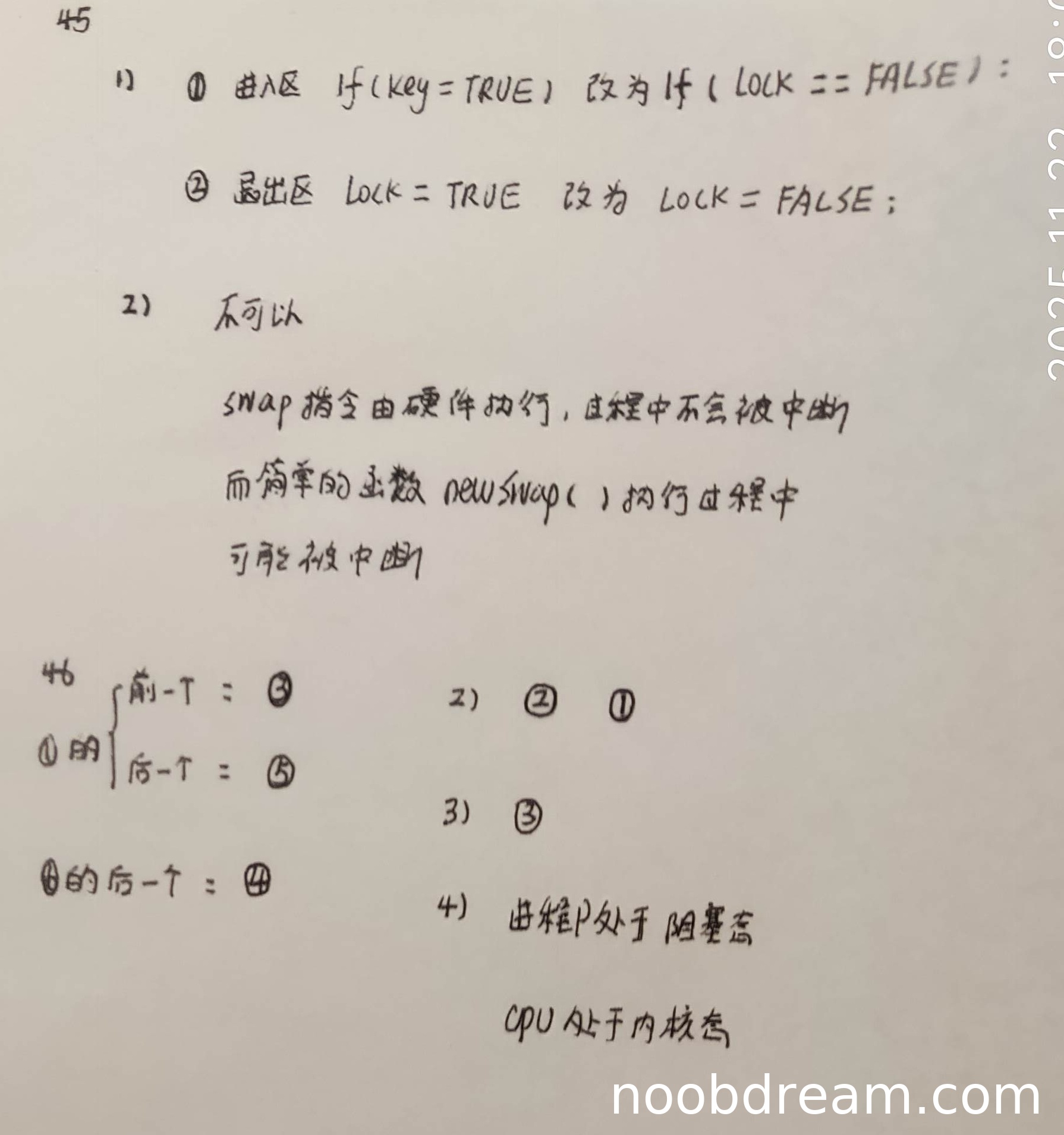 学生答案正确指出不能用 `newSwap` 函数代替 `swap` 指令,并给出了理由:`swap` 指令由硬件执行,过程中不会被中断,而 `newSwap` 函数执行过程中可能被中断。这与标准答案的核心观点一致,即 `swap` 是原子操作,而函数调用无法保证原子性。理由描述准确,因此本小题得3分。