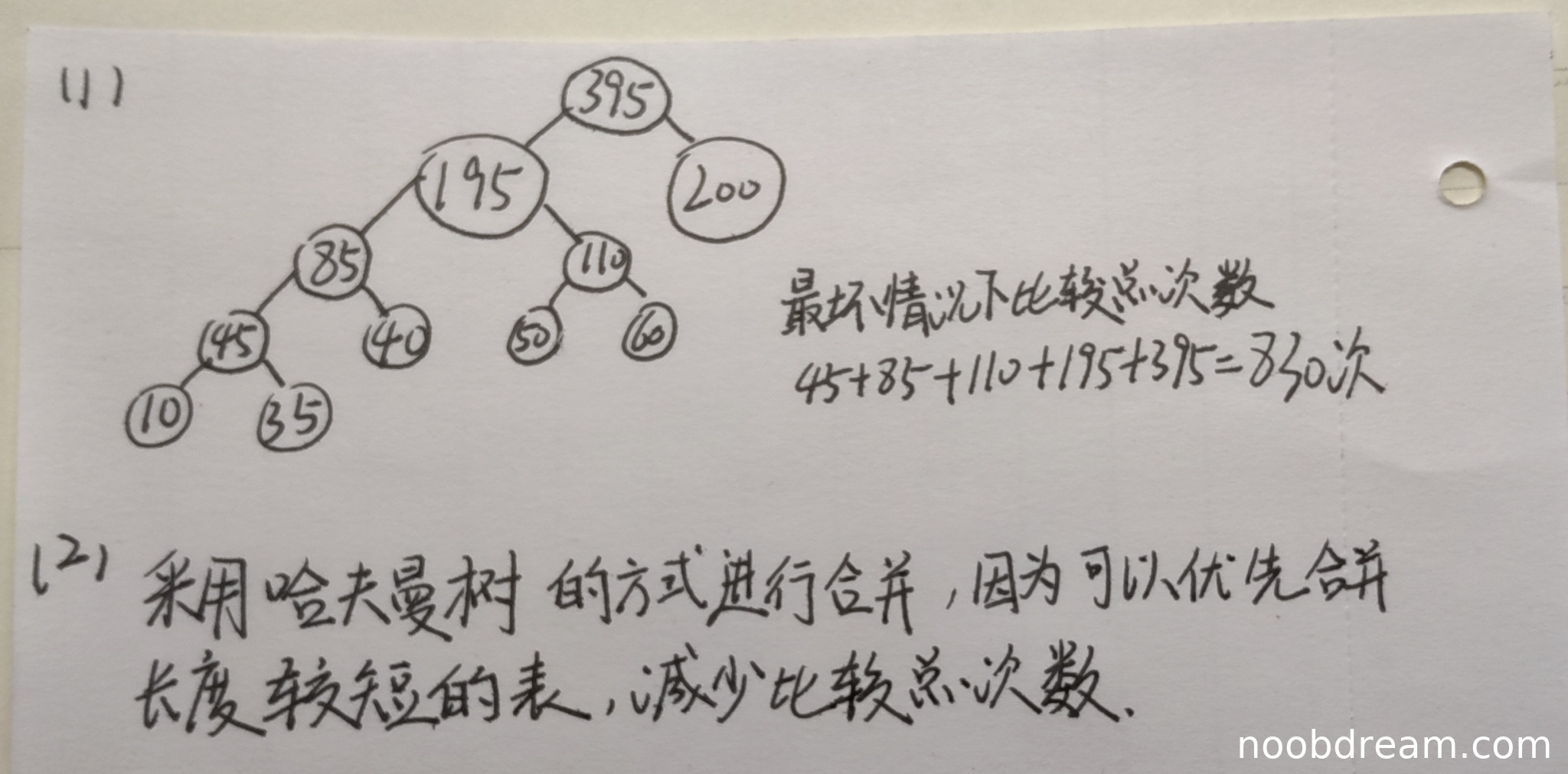 学生给出了合并策略(哈夫曼树方式),但未给出具体的合并过程,也没有详细计算每一步的比较次数。虽然最终计算的总比较次数为830次,但标准答案是825次,且学生未展示计算过程。根据评分说明,采用哈夫曼树思想但过程描述不完整,应给3分;计算过程缺失但结果错误,给0分。因此本部分得3分。
