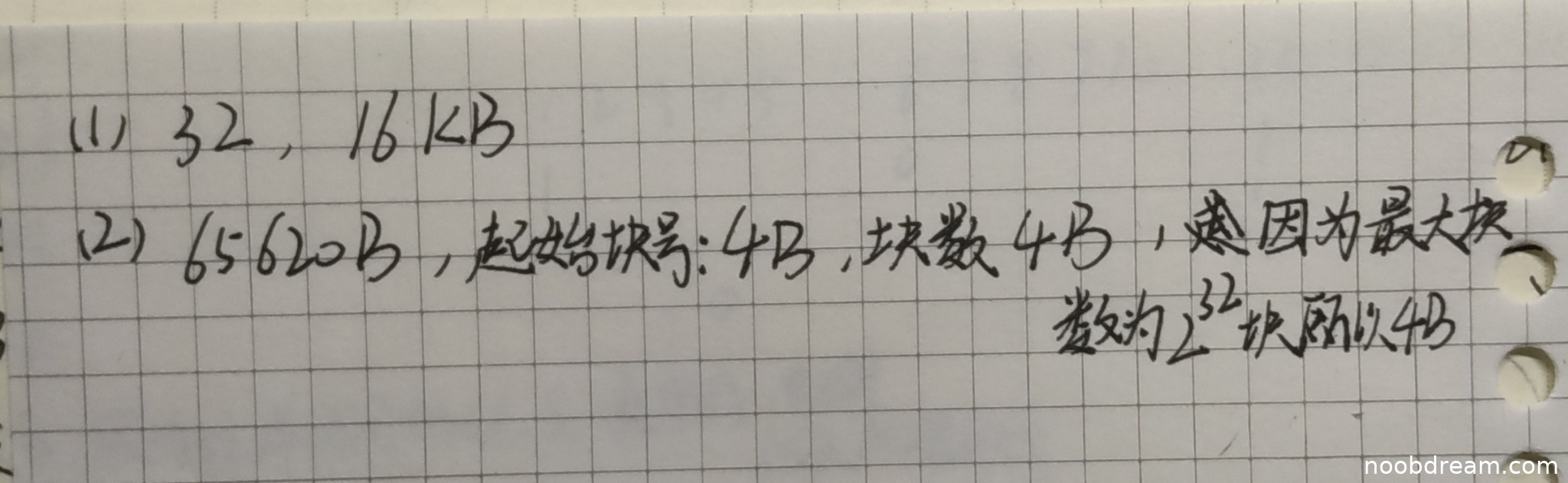 学生答案:最大长度65620B,起始块号4B/块数4B(第一次识别);起始块号43B/块数43B(第二次识别)。