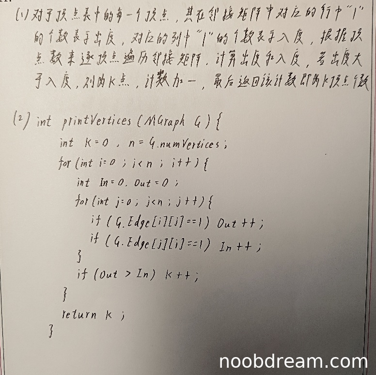 - 题目要求"输出G中所有K顶点",但代码中只统计了数量,没有输出顶点名称,这是功能缺失。考虑到题目明确要求输出顶点,这个逻辑错误较为严重。