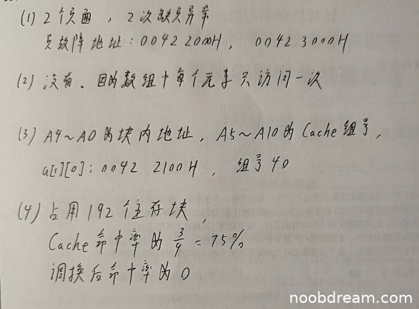 学生正确指出数组占用192个主存块。但Cache命中率计算错误(应为87.5%但计算为75%),循环调换后命中率计算错误(应为87.5%但计算为0)。两处计算错误各扣1分,共扣2分。得3分。