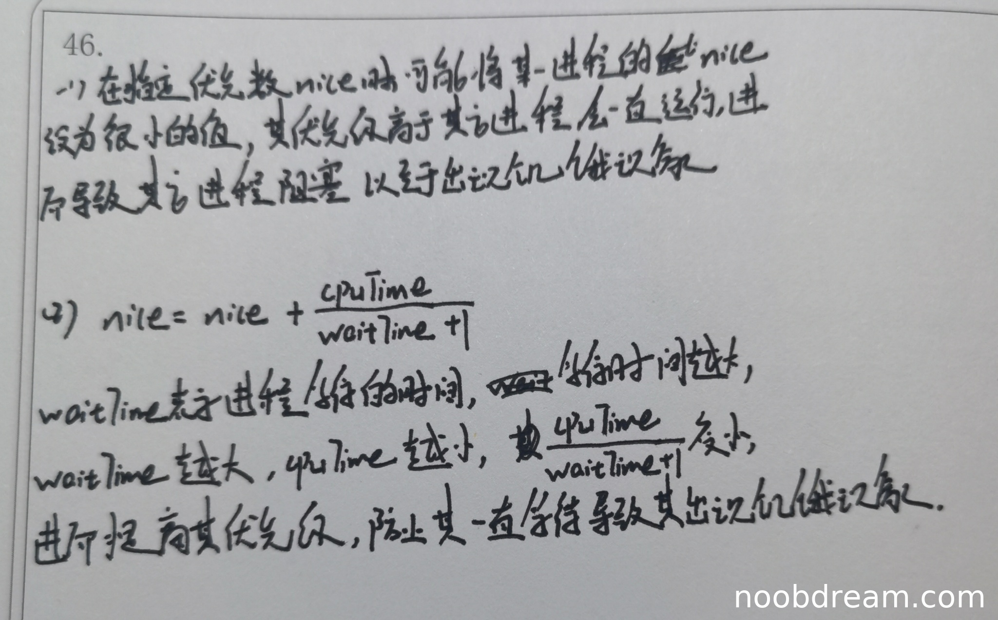 扣分点:公式设计存在逻辑问题。当cpuTime增加时,分子增大应该降低优先级(因为优先数越小优先级越高),但此公式中cpuTime增大反而会使优先数增大,这与调度目标不符。标准答案中cpuTime应该增加优先数,而waitTime应该减少优先数。