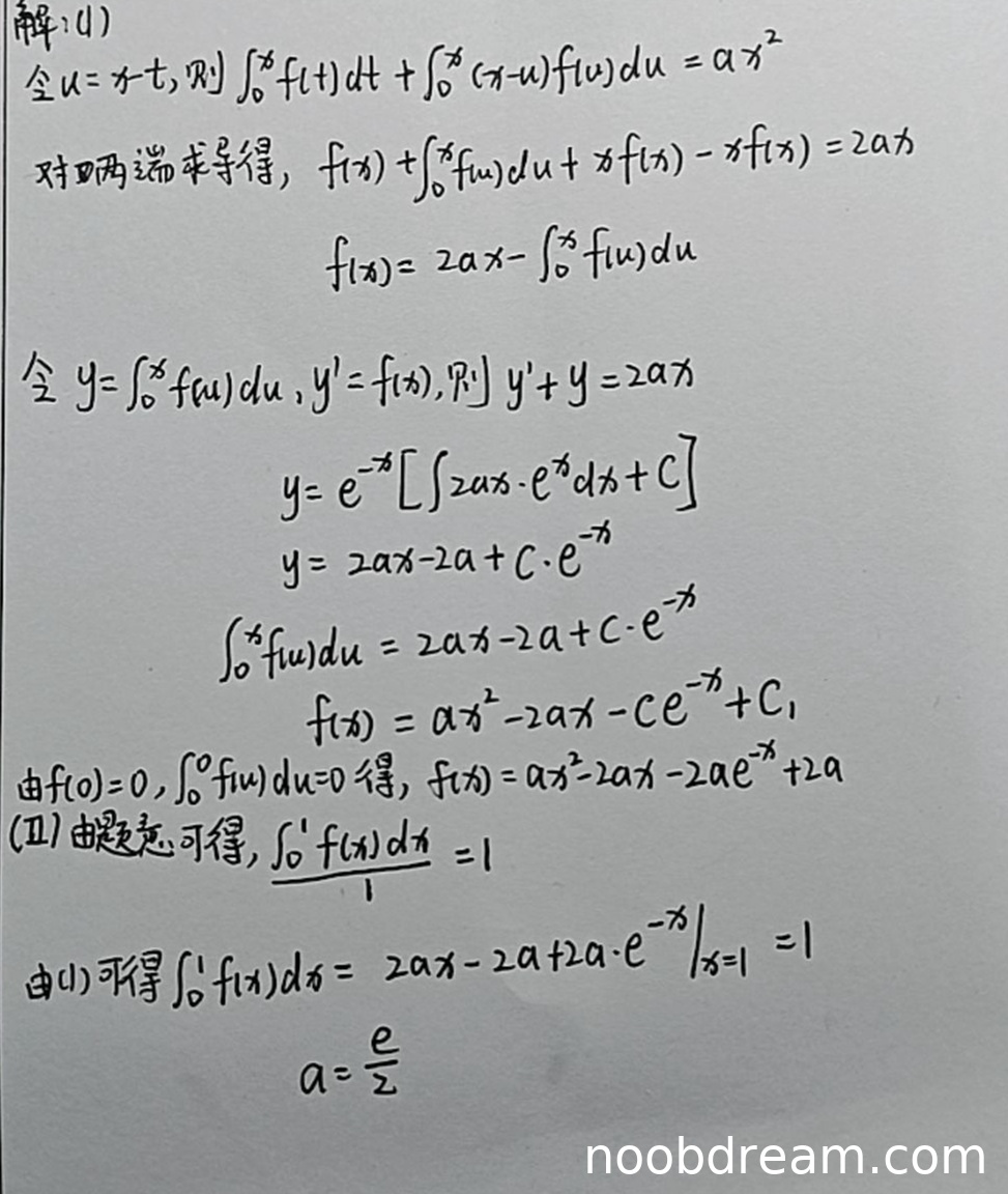 学生解答第(I)问时,在变量代换和建立微分方程部分思路正确(令u=x-t,得到f(x)+∫₀ˣf(u)du=2ax),但在求解微分方程时出现严重逻辑错误:
