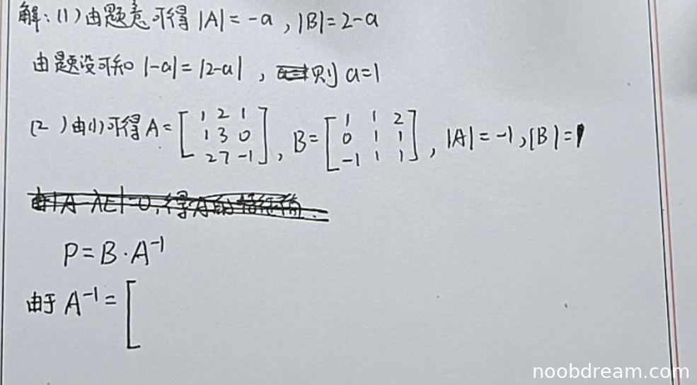 学生答案:通过行列式相等 |A| = |B| 得到 a=1。