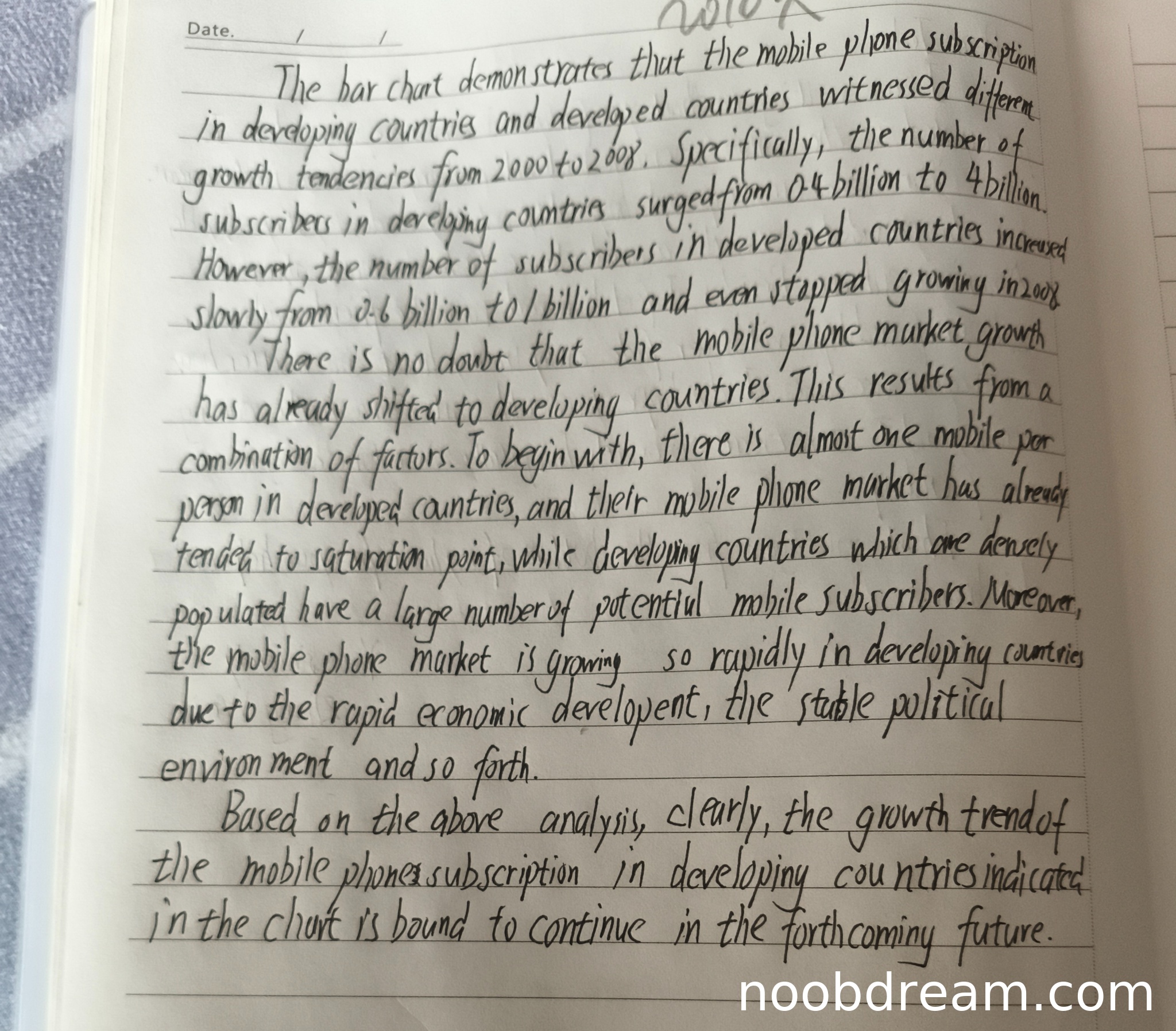 理由:学生作文很好地完成了图表解读任务。第一段准确描述了发展中国家和发达国家手机订阅量的变化趋势,包括具体数据对比(发展中国家从4亿增长到40亿,发达国家从6亿缓慢增长到10亿并在2008年停滞)。第二段给出了合理的评论,分析了发展中国家增长迅速的原因(市场饱和度差异、人口基数、经济发展等)。内容要点完整,没有遗漏重要信息。