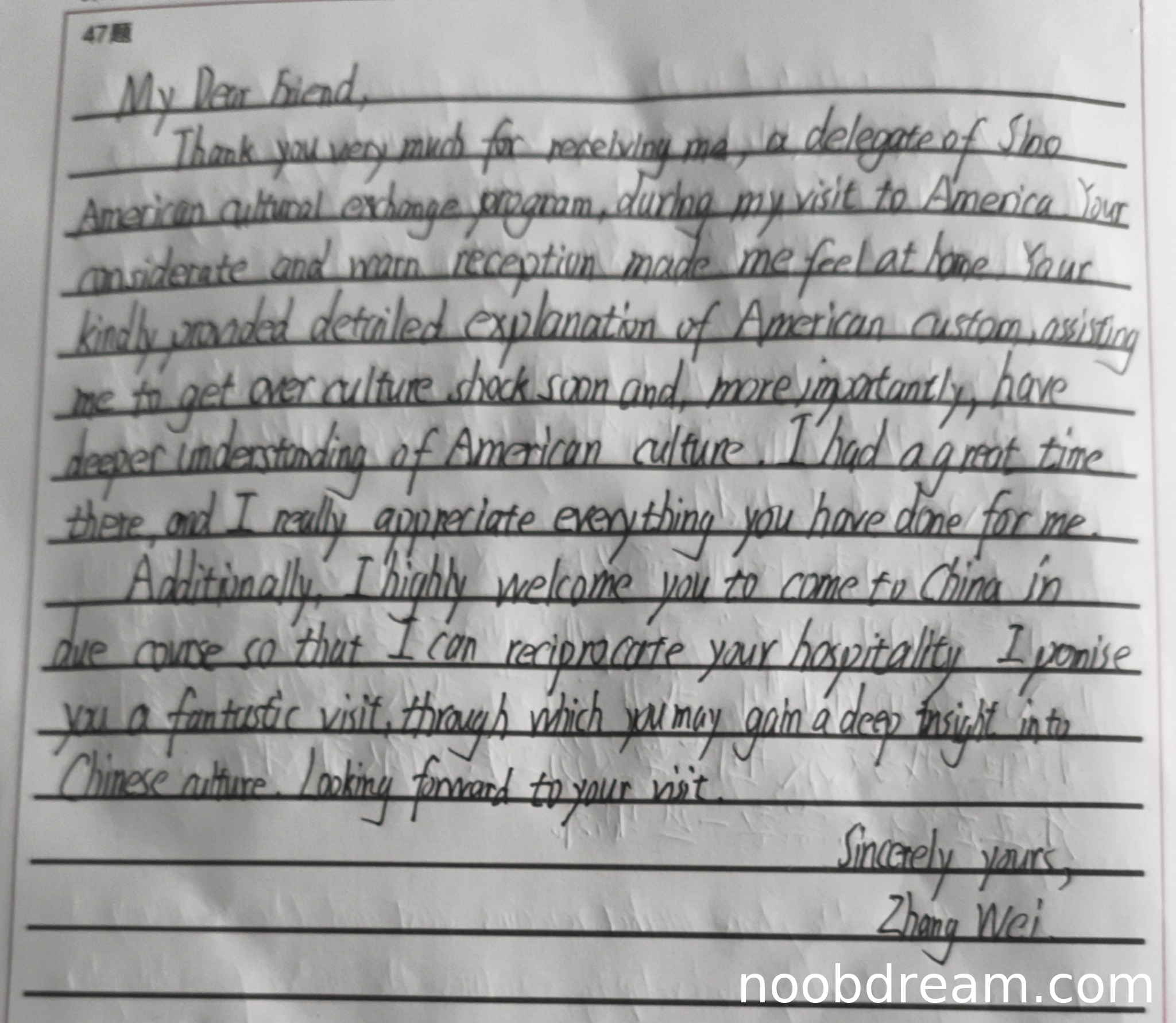 理由:格式完全正确,包含称呼、正文、结束语和签名。语域恰当,既保持了正式书信的礼貌性,又体现了同事间的友好关系。"Sincerely yours"和"Zhang Wei"的签名符合题目要求。