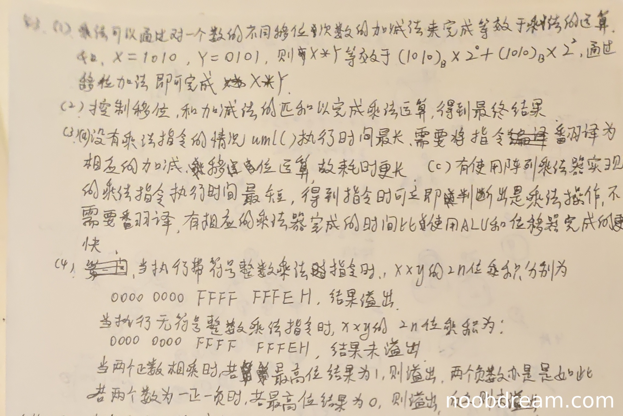 第三问:学生尝试给出溢出判断规则,但描述存在错误(如“两个正数相乘最高位为1则溢出”不全面,且未明确针对无符号乘法的高n位判断),与标准答案“高n位全为0则无溢出”不符,扣1分。得1分。