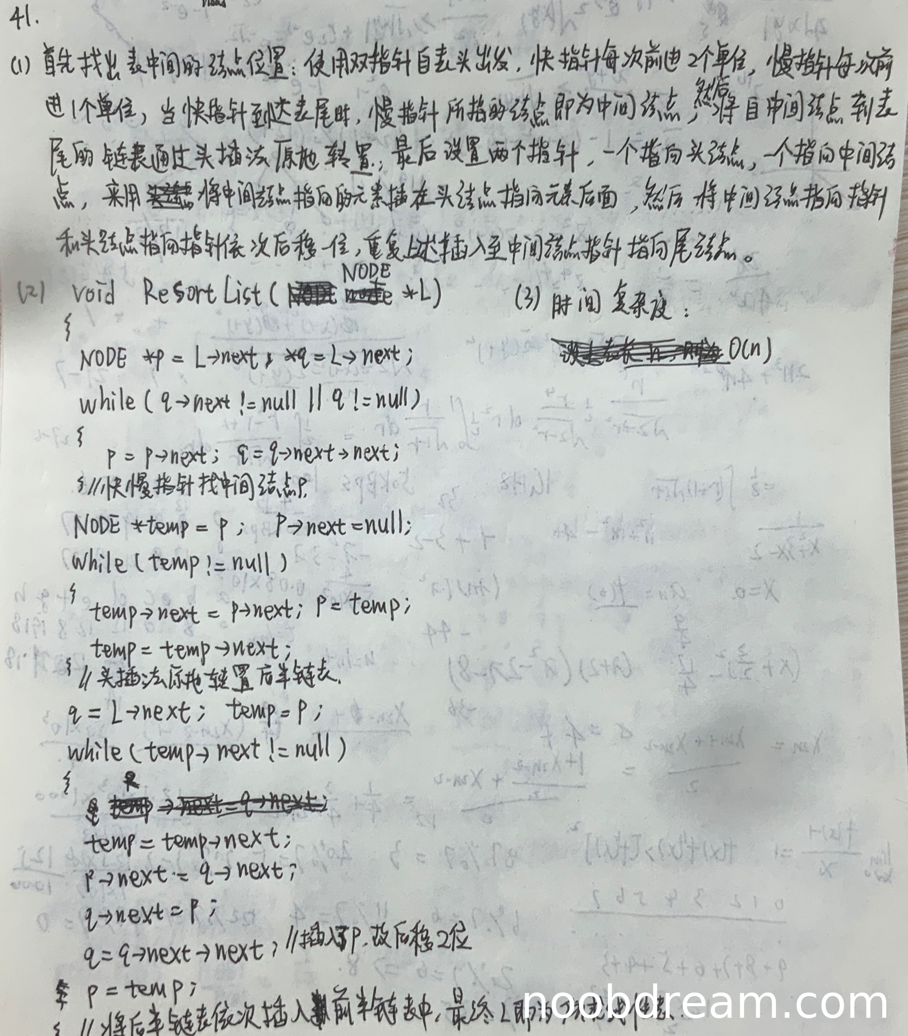 while (q->next != null || q != null) 应该使用 && 而不是 ||,且应判断 q != NULL 和 q->next != NULLtemp->next = p->next; p = temp; 没有正确维护反转过程(3)得分及理由(满分2分)