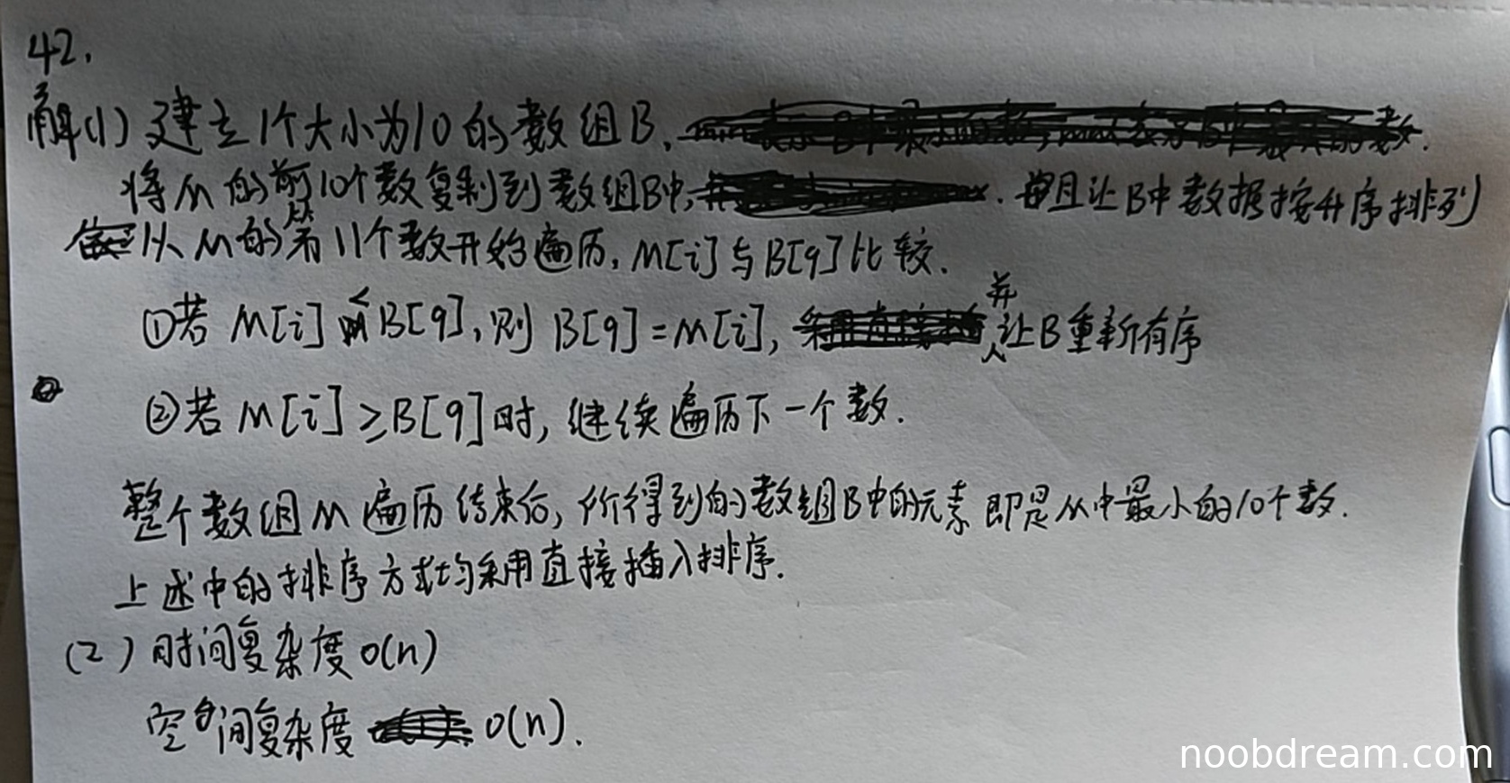 学生正确给出了时间复杂度O(n),因为需要遍历n个元素,每次插入操作的时间复杂度为O(1)(因为k=10是常数)。但空间复杂度标注为O(n)是不正确的,因为算法只使用了一个固定大小为10的辅助数组B,与n无关,空间复杂度应为O(1)。因此扣1分,得4分。