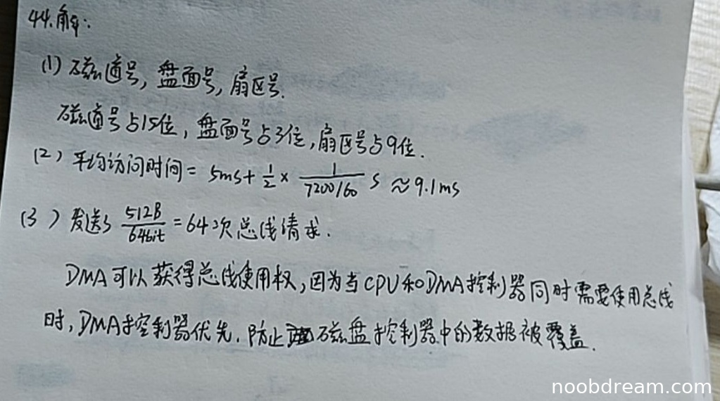 学生给出的平均访问时间计算公式为:平均访问时间 = 平均寻道时间 + 平均延迟时间。其中,平均寻道时间5ms正确,平均延迟时间计算为1/2×1/(7200/60)s ≈ 4.167ms(虽然学生写的结果是≈9.1ms,但根据公式推导,其计算过程包含了平均延迟时间)。然而,学生漏算了传输时间(盘片转一个扇区的时间)。标准答案中传输时间约为0.017ms,虽然数值较小,但理论上应包含在内。由于学生未计算传输时间,存在逻辑不完整,扣1分。本小题得1分。