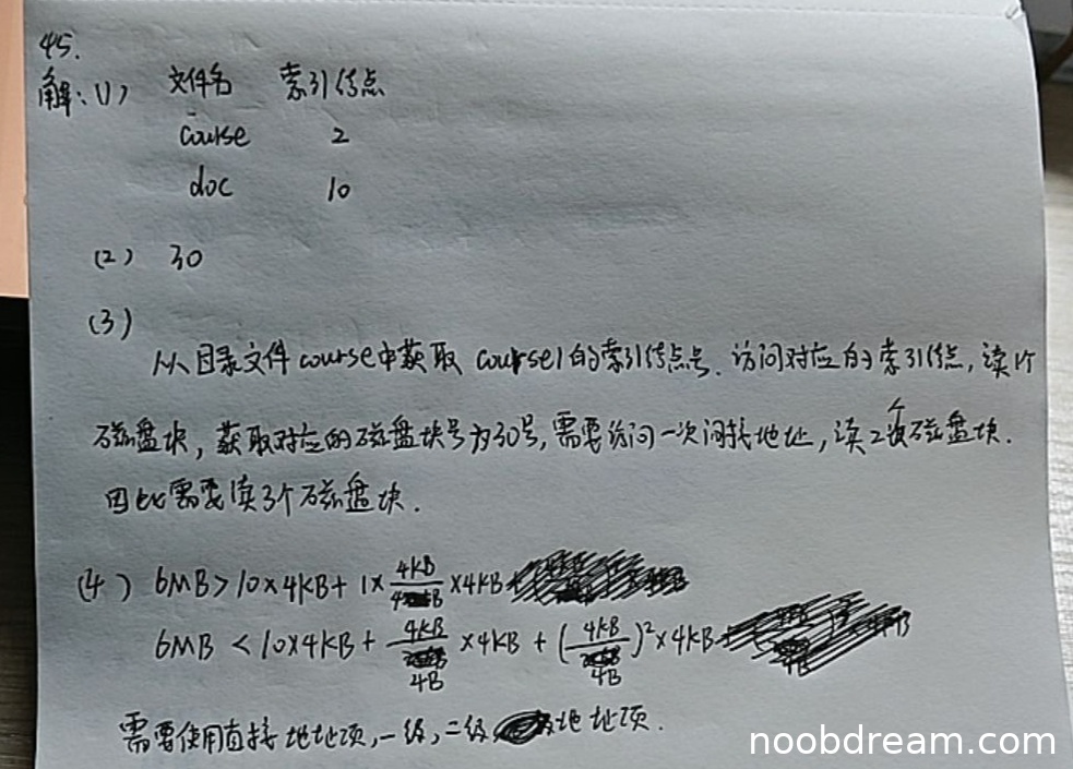 学生答案认为需要读3个磁盘块,但标准答案为2个磁盘块。学生错误地认为需要访问一次间接地址,实际上根据图示,course1的磁盘块号30是直接地址项指向的,不需要间接寻址。因此扣2分,得0分。