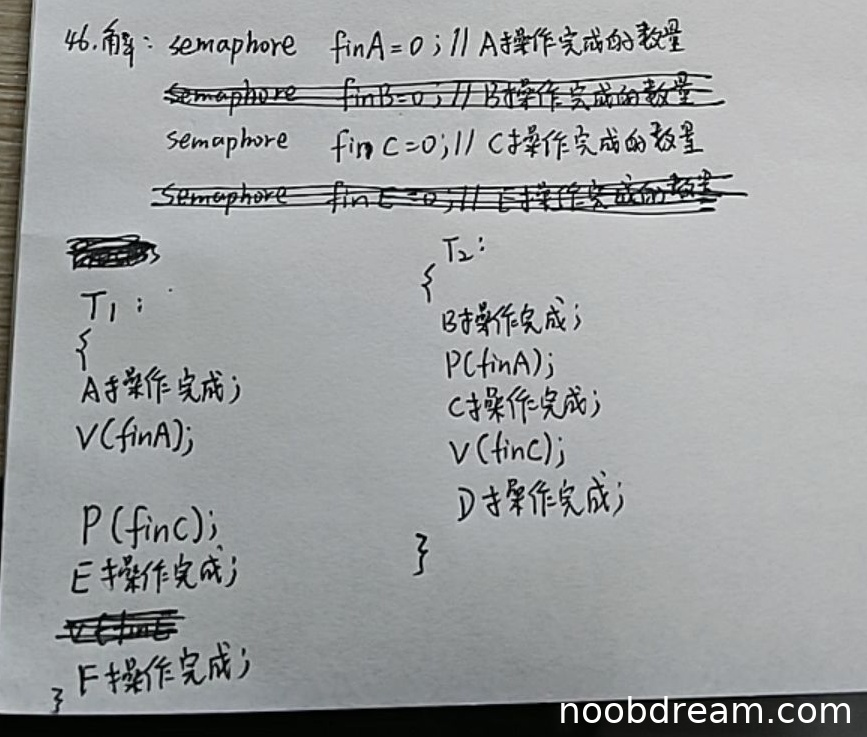 学生第一次识别结果定义了2个信号量(finA、finC),第二次识别结果定义了3个信号量(finA、finB、finC)。但实际需要的同步关系是:C需要等待A和B完成,E需要等待C完成。学生定义的信号量中: