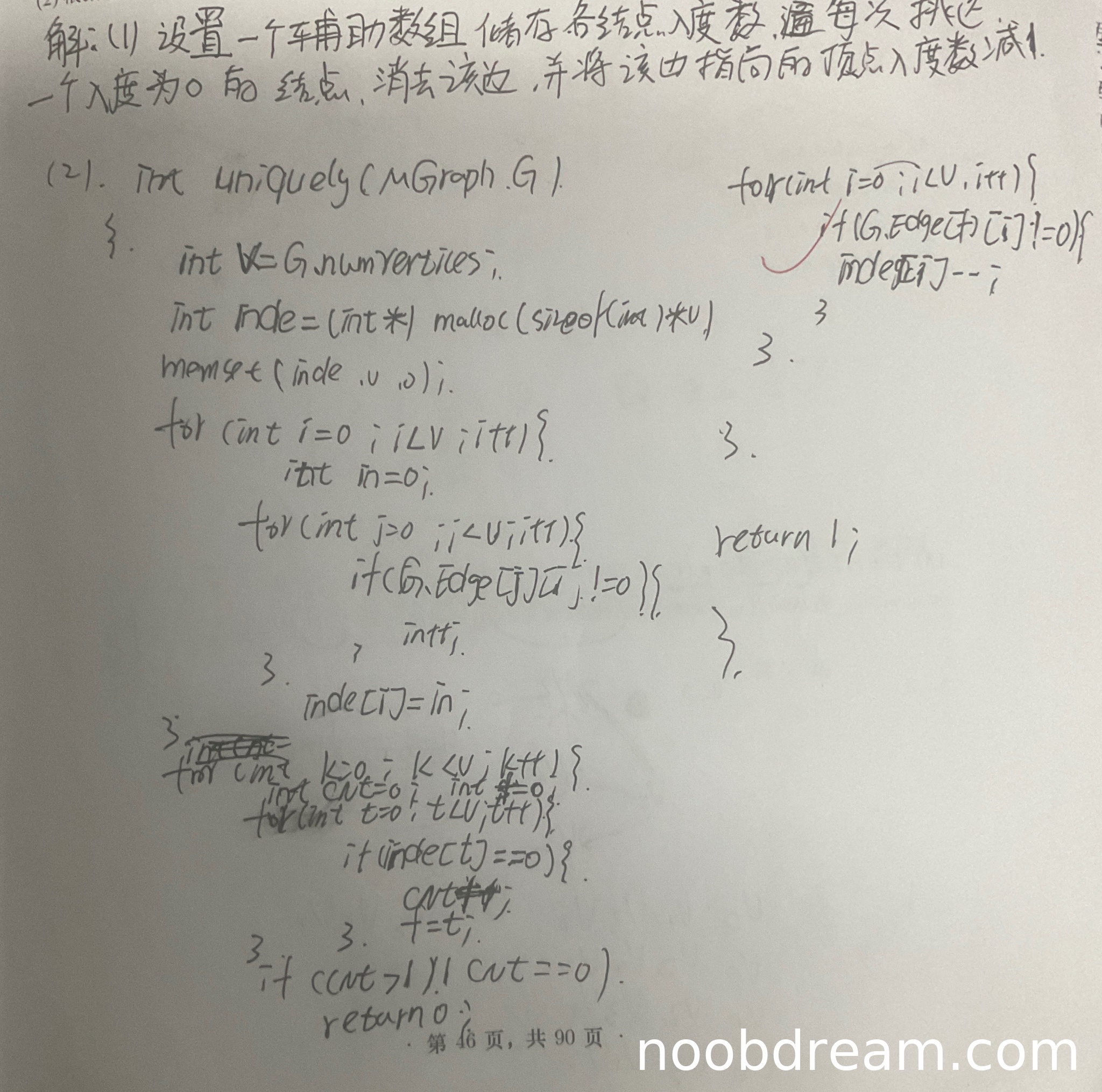 由于代码逻辑不完整且存在错误,无法正确实现拓扑序列唯一性判断,扣5分。得4分。