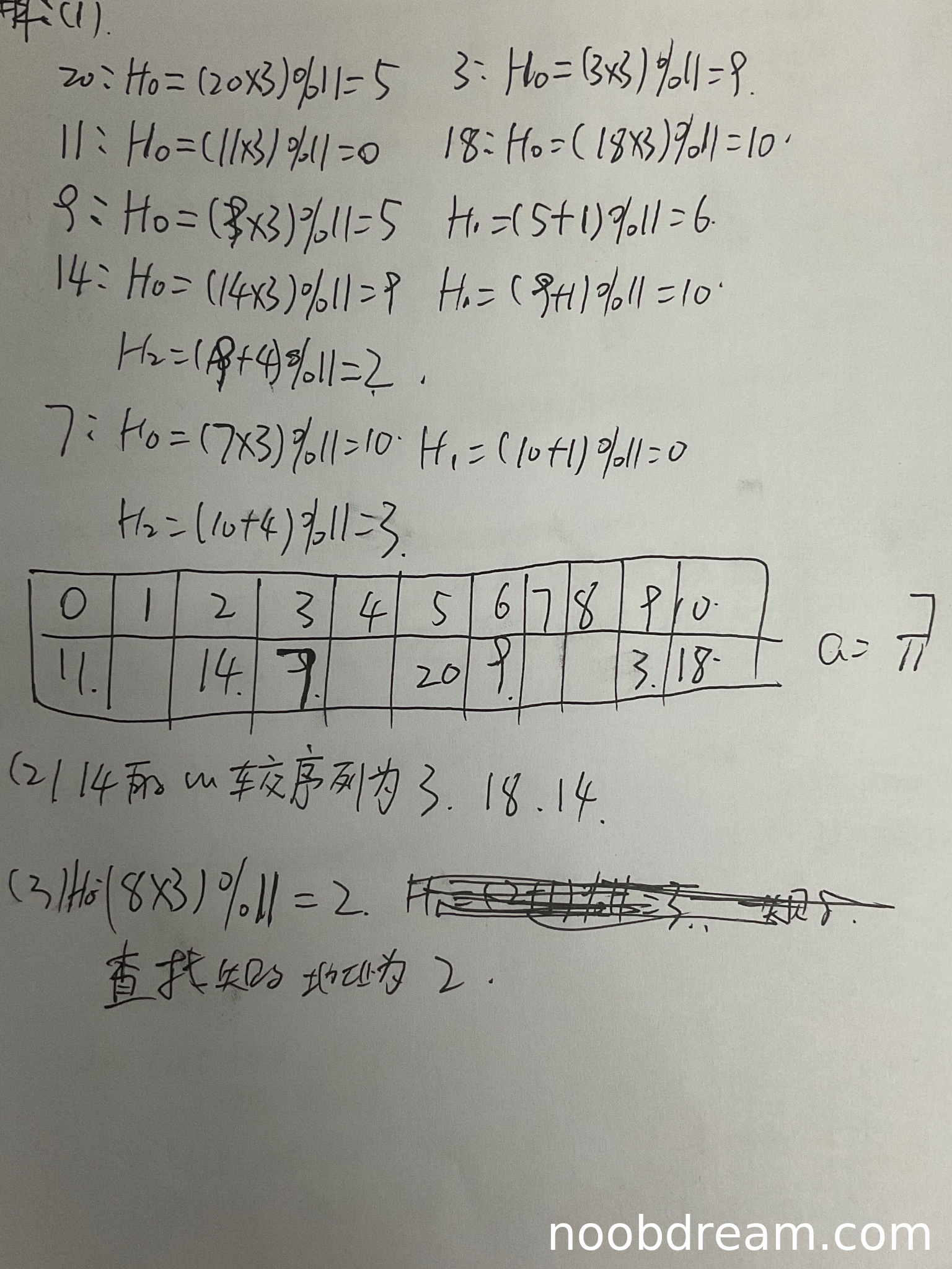 学生正确计算了所有关键字的初始散列地址和冲突处理后的地址,并正确绘制了散列表。但在表格中,位置3处误写为"9"(应为"7"),位置9处误写为"9."(应为"3"),位置10处误写为"18."(应为"18")。这些识别错误不影响核心逻辑,且装填因子计算正确(7/11)。因此扣1分。