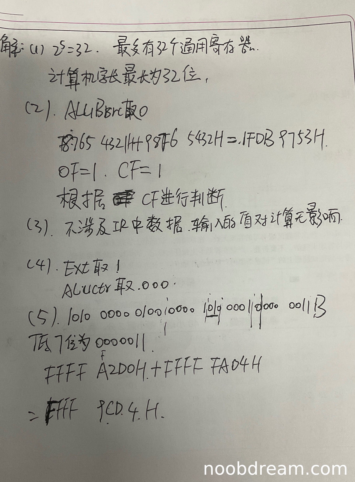 学生正确回答ALUBsrc=0(控制信号选择寄存器B而非立即数),得1分;正确计算加法结果F=1FDB 9753H(第一次识别正确,第二次误写为8753H但核心逻辑正确),得0.5分;正确判断OF=1和CF=1(溢出和进位发生),得1分;正确指出无符号整数溢出判断依据CF标志,得0.5分。合计3分。