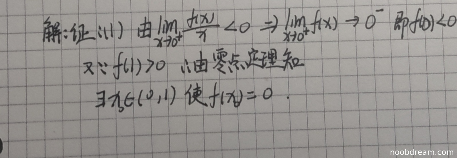 学生作答中,第一部分试图证明方程 \( f(x) = 0 \) 在区间 \((0,1)\) 内至少存在一个实根。学生首先由极限条件 \(\lim_{x \to 0^{+}} \frac{f(x)}{x} < 0\) 推出 \(\lim_{x \to 0^{+}} f(x) \to 0^{-}\) 并直接得出 \( f(0) < 0 \)。然而,标准答案中并未直接给出 \( f(0) < 0 \),而是利用极限保号性得出在 \((0, \delta)\) 内 \( f(x) < 0 \),从而存在点 \( x_0 \) 使得 \( f(x_0) < 0 \),再结合 \( f(1) > 0 \) 和零点定理证明根的存在性。学生直接断言 \( f(0) < 0 \) 存在逻辑跳跃,因为 \( f(x) \) 在 \( x=0 \) 处可能未定义或不连续,尽管极限条件暗示 \( f(0) \) 可能为 0 或负,但严格证明需通过保号性。此外,学生未明确说明 \( f(x) \) 的连续性(尽管可导隐含连续),但核心错误在于未正确应用保号性来证明存在负值点。因此,扣 2 分。理由:逻辑不严谨,未使用极限保号性详细论证存在 \( x_0 \) 使 \( f(x_0) < 0 \),直接得出 \( f(0) < 0 \) 可能不成立(例如 \( f(0) = 0 \) 但导数负的情况)。得分:3 分(满分 5 分)。