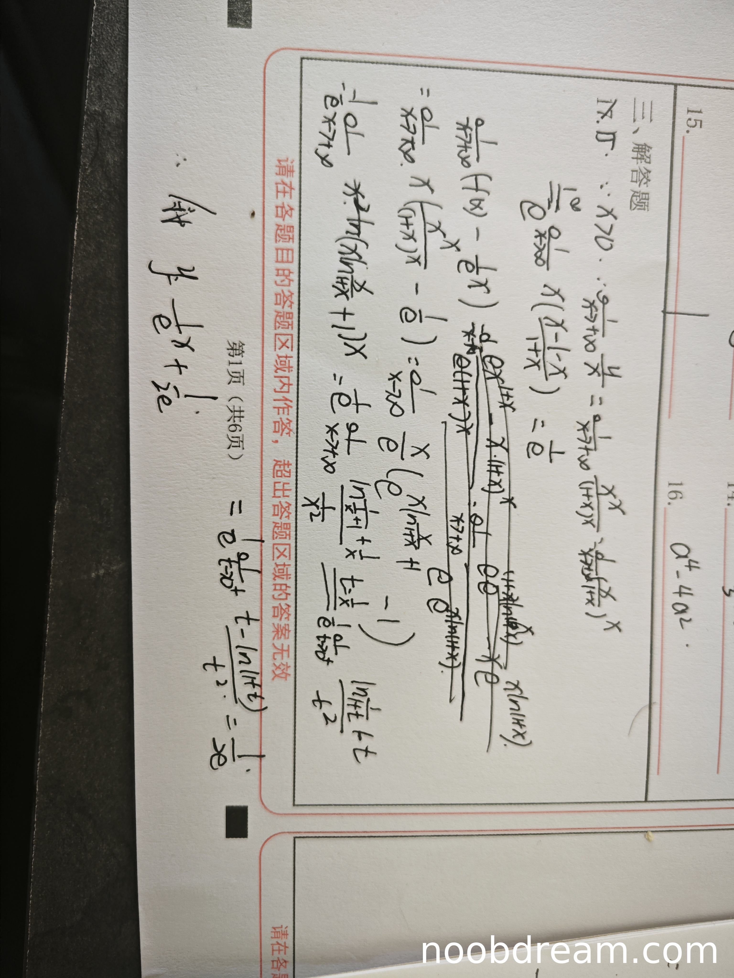 学生作答给出了斜渐近线方程,但结果与标准答案不符。第一次识别结果为 \( y = \frac{1}{e}x + 3e \),第二次识别无法提取有效内容。计算斜率 \( k = \frac{1}{e} \) 正确,但截距 \( b = 3e \) 错误(应为 \( \frac{1}{2e} \))。由于截距计算涉及复杂的极限过程,学生未展示正确推导步骤,且最终结果错误,因此不能给分。但考虑到斜率部分正确,给予部分分数。