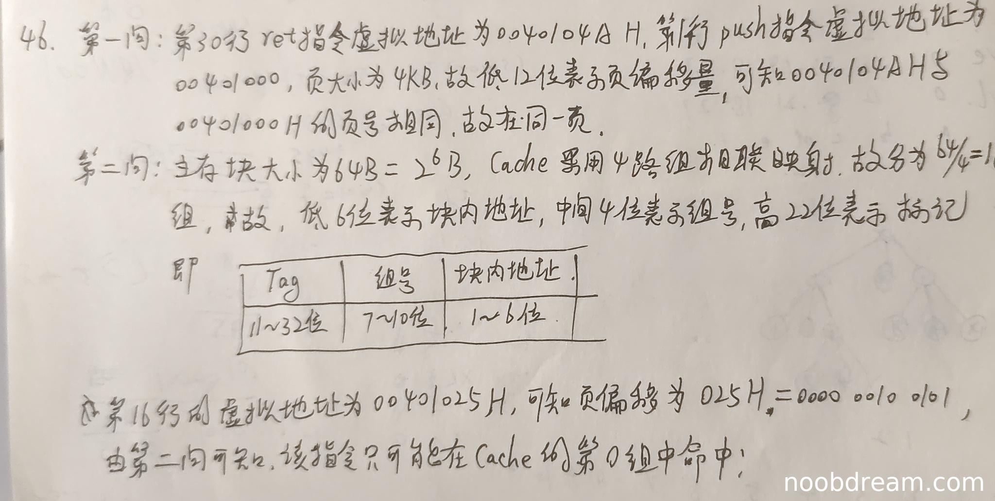 学生正确指出读取第16行call指令时只可能在Cache第0组中命中,并给出了地址00401025H的页内地址025H对应的组号计算(0000B=0),与标准答案一致。得1分。