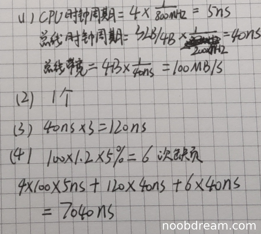 学生答案中CPU时钟周期计算错误(5ns应为1.25ns),总线时钟周期计算错误(40ns应为5ns),总线带宽计算错误(100MB/s应为800MB/s)。三个关键计算均错误,但总线带宽的计算方法(4B/总线时钟周期)思路正确。根据标准答案,每个部分正确得1分,但学生三个部分均错误,因此得0分。