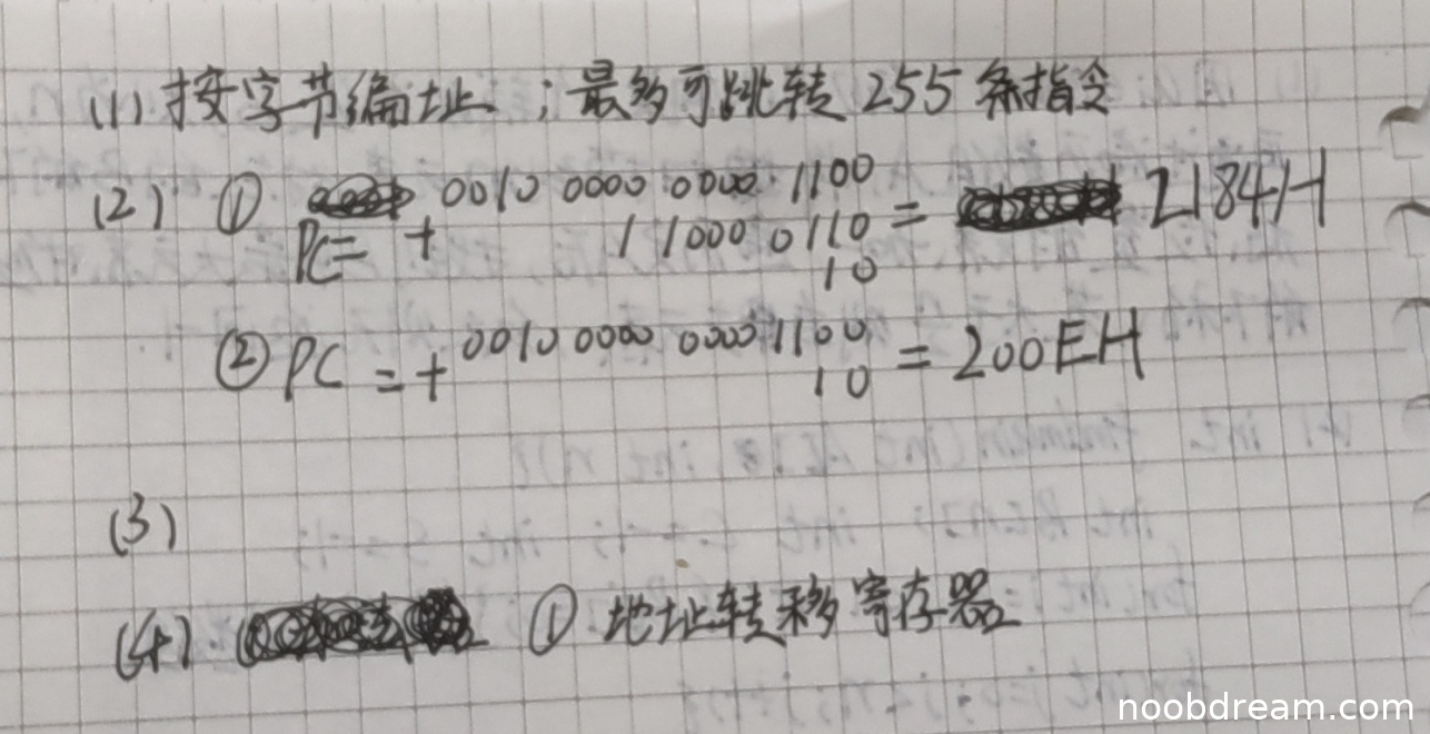 学生回答存储器按字节编址是正确的,得1分。但回答最多可跳转255条指令错误,因为偏移量OFFSET是8位补码,范围为-128~127,向后最多跳转127条指令。学生回答255条指令说明未理解补码范围,扣2分。本小题得1分。