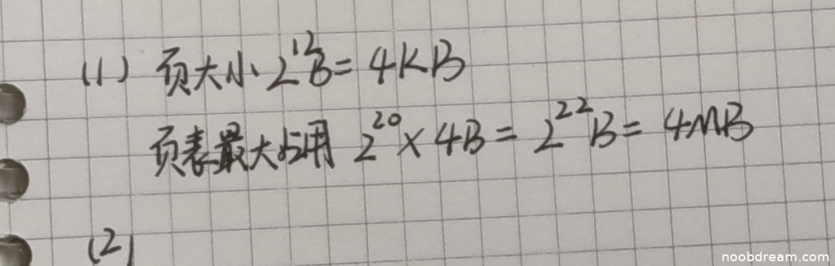 学生答案正确计算了页大小和页表最大占用空间。页内偏移量12位对应页大小2^12B=4KB,页号20位对应页表项数2^20,每个页表项4字节,所以页表最大占用2^20×4B=4MB。与标准答案完全一致,得3分。