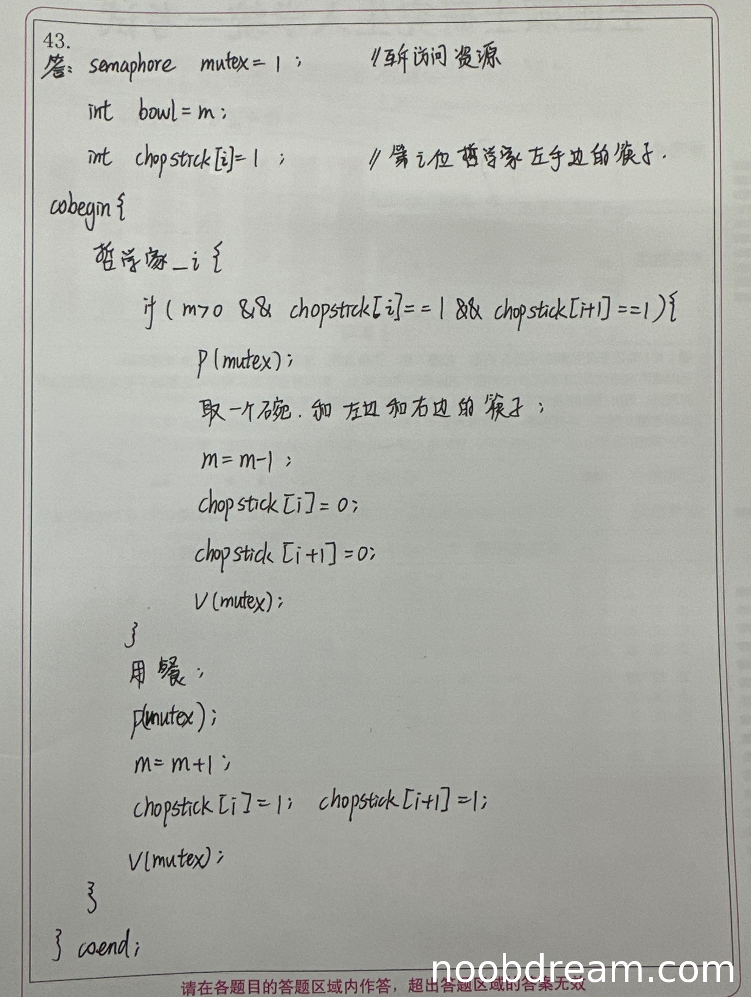 理由:学生的方案无法有效防止死锁。当所有哲学家同时执行到条件判断时,可能都认为资源可用而进入临界区,导致死锁。标准答案通过限制同时进餐的哲学家数量(min(n-1, m))来防止死锁,这是关键的安全措施。