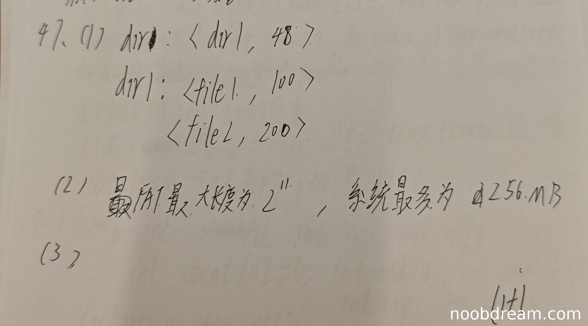 学生答案中给出了dir目录文件的内容为<dir1, 48>,dir1目录文件的内容为<file1, 100>和<file2, 200>,与标准答案完全一致。虽然识别结果中出现了"47"等无关字符,但根据禁止扣分规则,这些属于识别错误或多余信息,不扣分。因此本小题得3分。