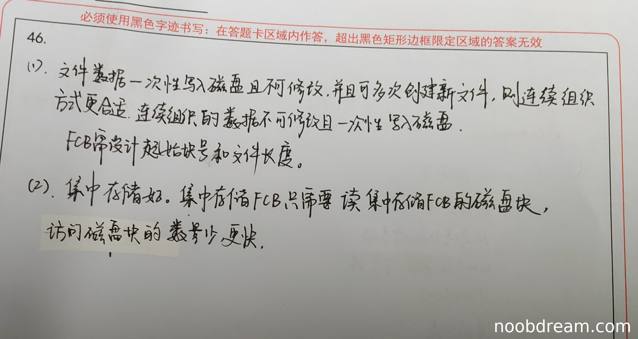 学生答案正确选择了集中存储,并给出了理由(集中存储FCB只需要读集中存储FCB的磁盘块,访问磁盘块的数量少,更快),这与标准答案中“将FCB集中存储,最大化减少了存储FCB需要的磁盘块数量,这样在随机查找文件时,只需要访问FCB对应的磁盘块,最大化减少了磁头移动和磁盘I/O次数”的核心逻辑一致。本小题满分3分,学生答案完全正确,得3分。