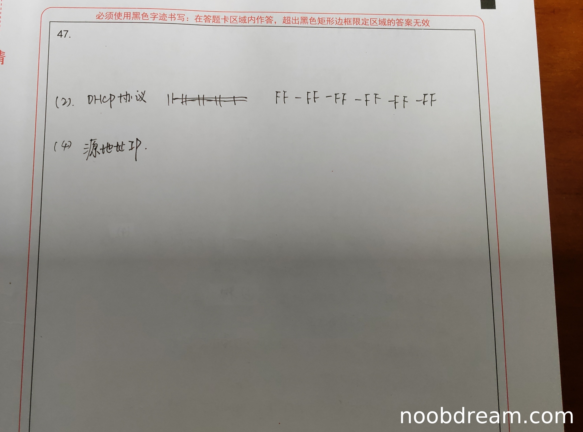 学生回答中,协议部分写的是"DHCP协议",这是错误的,正确应为ARP协议,因此扣1分。目的MAC地址部分回答正确(FF-FF-FF-FF-FF-FF),得1分。本小题共得1分。