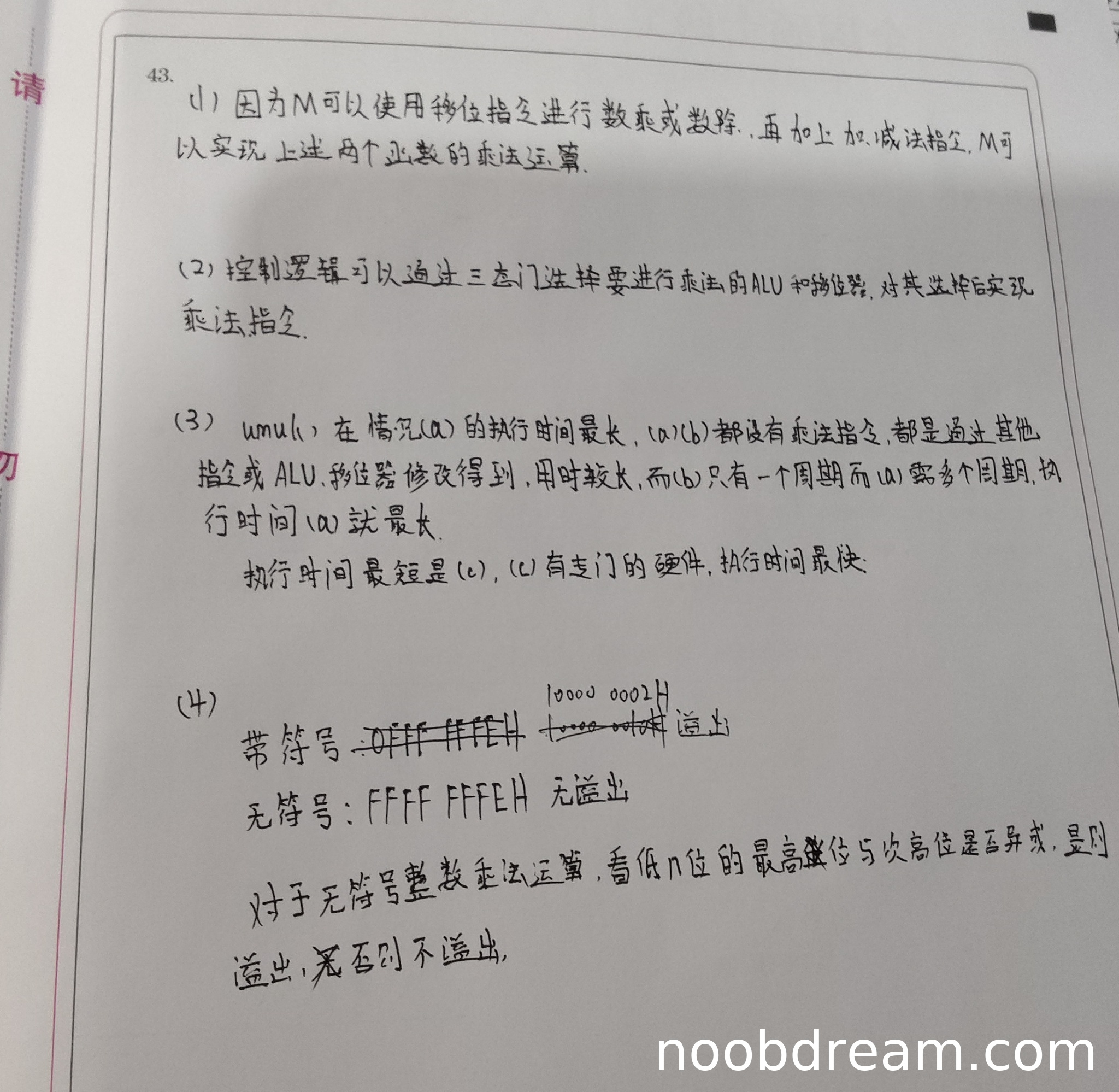 第一问:带符号乘积答案错误(应为00000000FFFFFFFEH),无符号乘积答案正确(FFFFFFFFEH)。第二问:umul()和imul()的溢出判断正确。第三问:溢出判断方法错误(标准答案应为检查高n位是否为0)。根据各部分分值分配,第一问扣2分,第三问扣2分,第二问不扣分。
